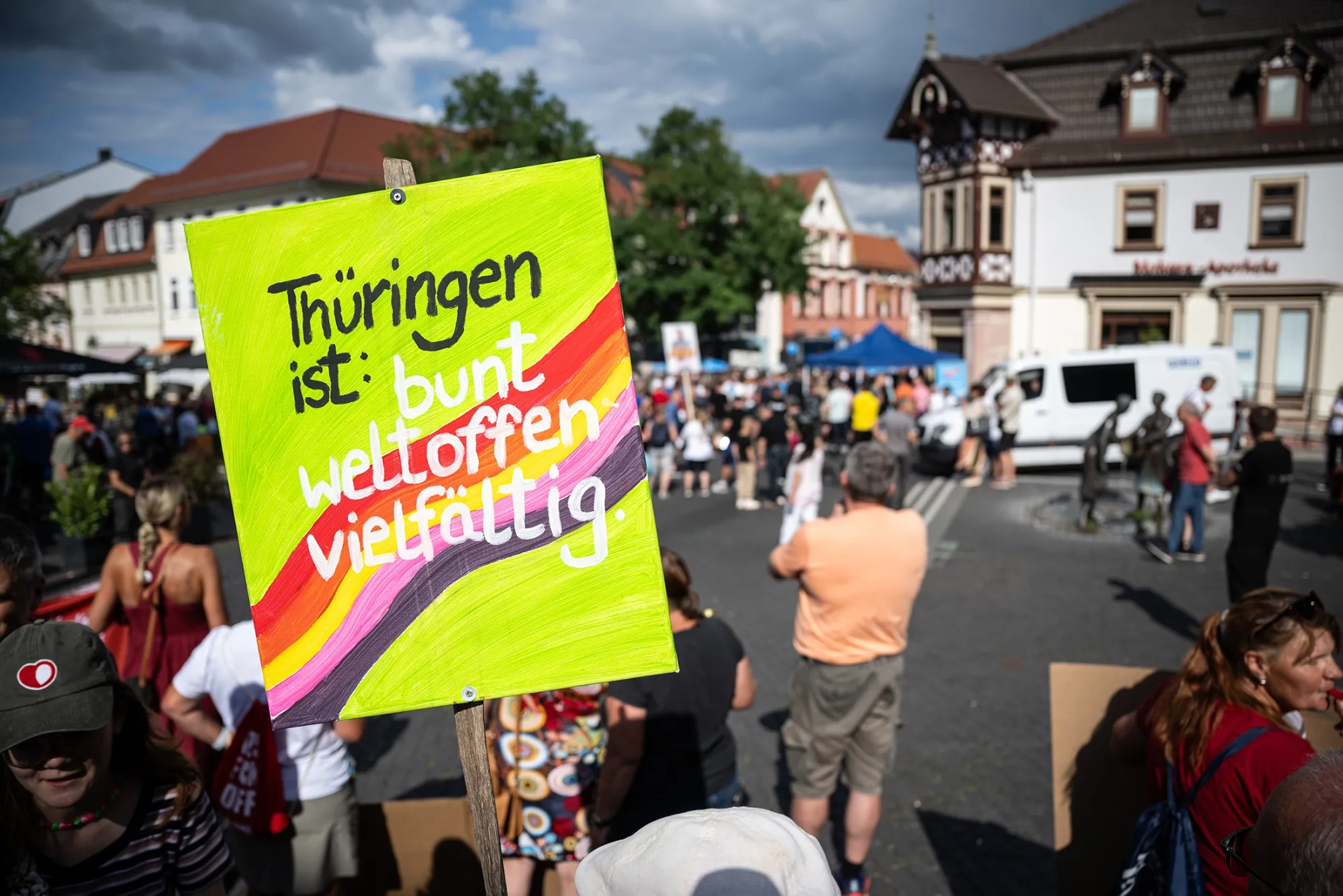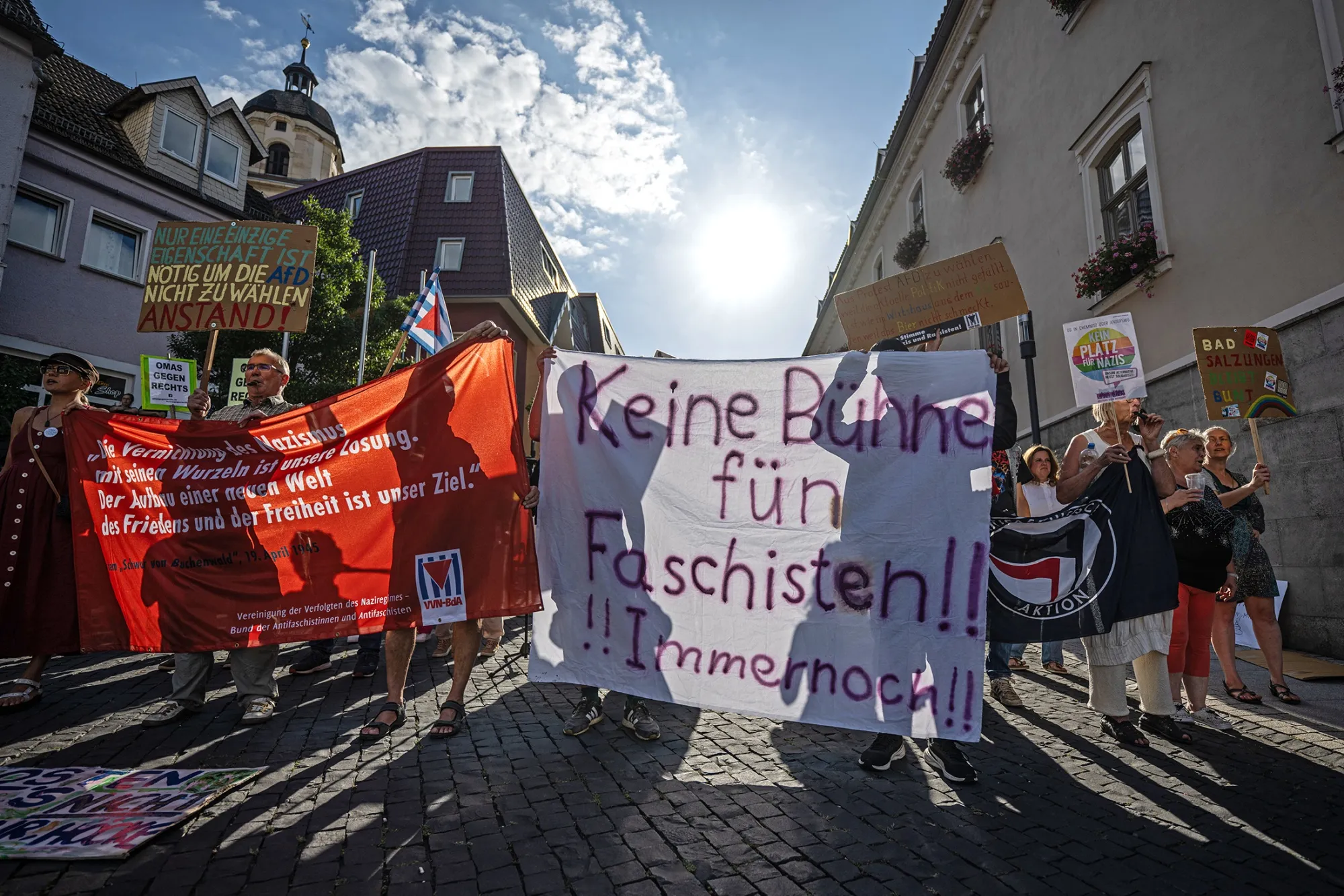 在当局确保双方在图林根州巴德萨尔宗根的市场广场保持安全距离的情况下,示威者高喊“纳粹滚出去”等口号,试图干扰极右翼德国选择党(AfD)的竞选集会。这种对峙在该国日益对立的 政治格局中已成为常态。