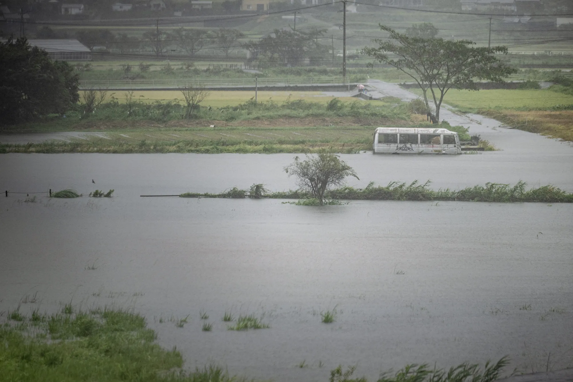 8月29日,大分县由布市的公交车被洪水淹没。摄影师:山崎祐一/法新社/盖蒂图片社根据伦敦帝国学院的一项研究,本周袭击日本南部的台风“山山”伴随着强降雨和强风,可能因气候变化而加剧。