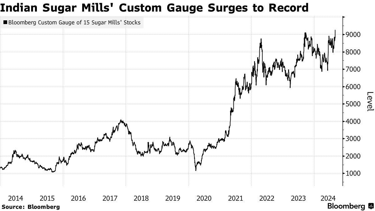 Triveni 工程与工业有限公司上涨超过 10%,Shree Renuka 糖业有限公司和 Bajaj Hindusthan 糖业有限公司几乎上涨 10%,而 Dwarikesh 糖业有限公司和 Balrampur Chini Mills Ltd. 上涨了多达 8%。彭博社对前 15 家糖厂的评估达到了创纪录的水平。