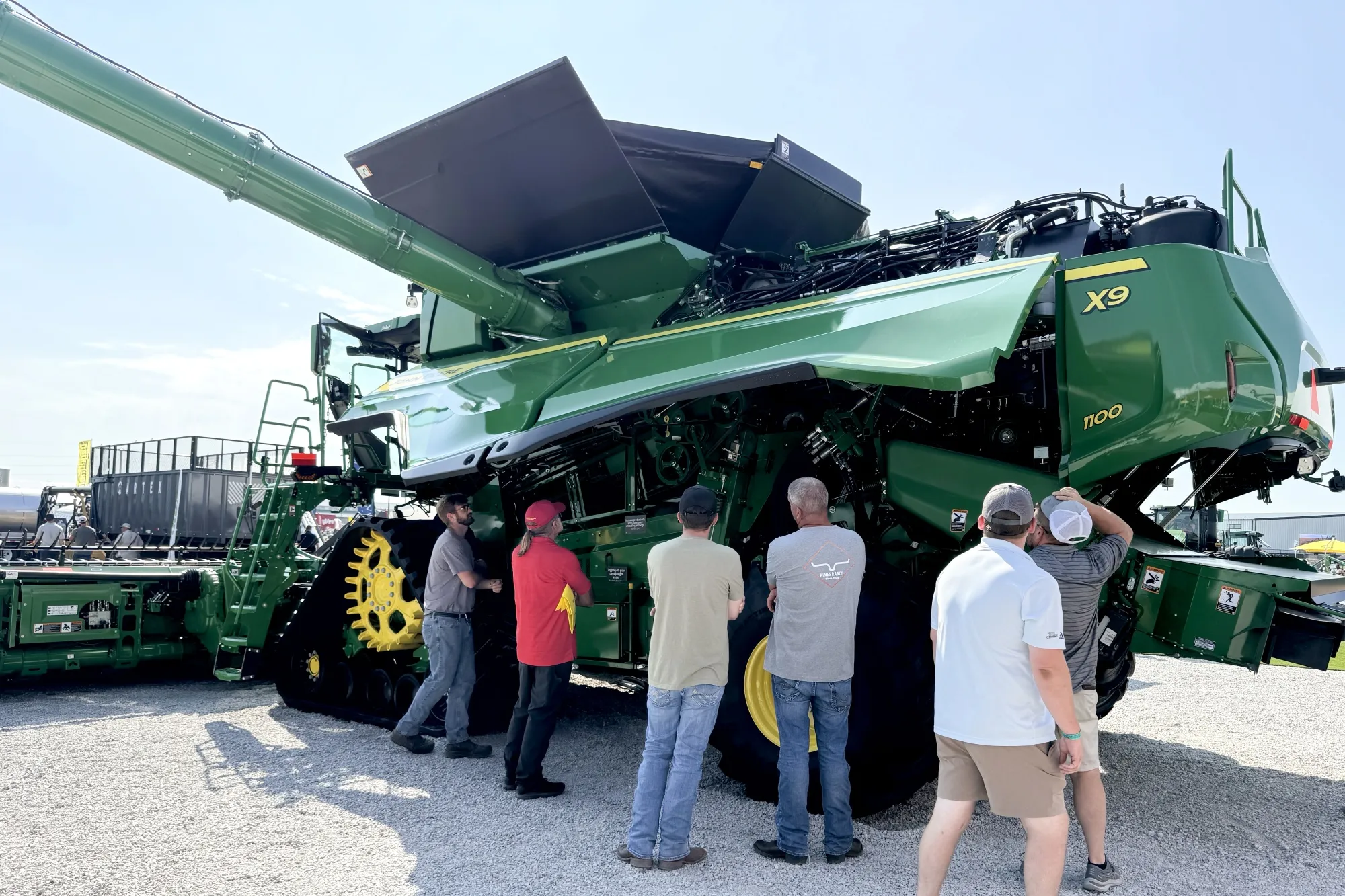 与会者在农场进展展览会上查看约翰·迪尔公司X9 1100联合收割机。摄影师:迈克尔·赫尔策/彭博社华丽的新技术通常是贸易展的明星。但在农场进展展览会上,作为美国最大的户外农业活动,二手拖拉机是最大的吸引力。