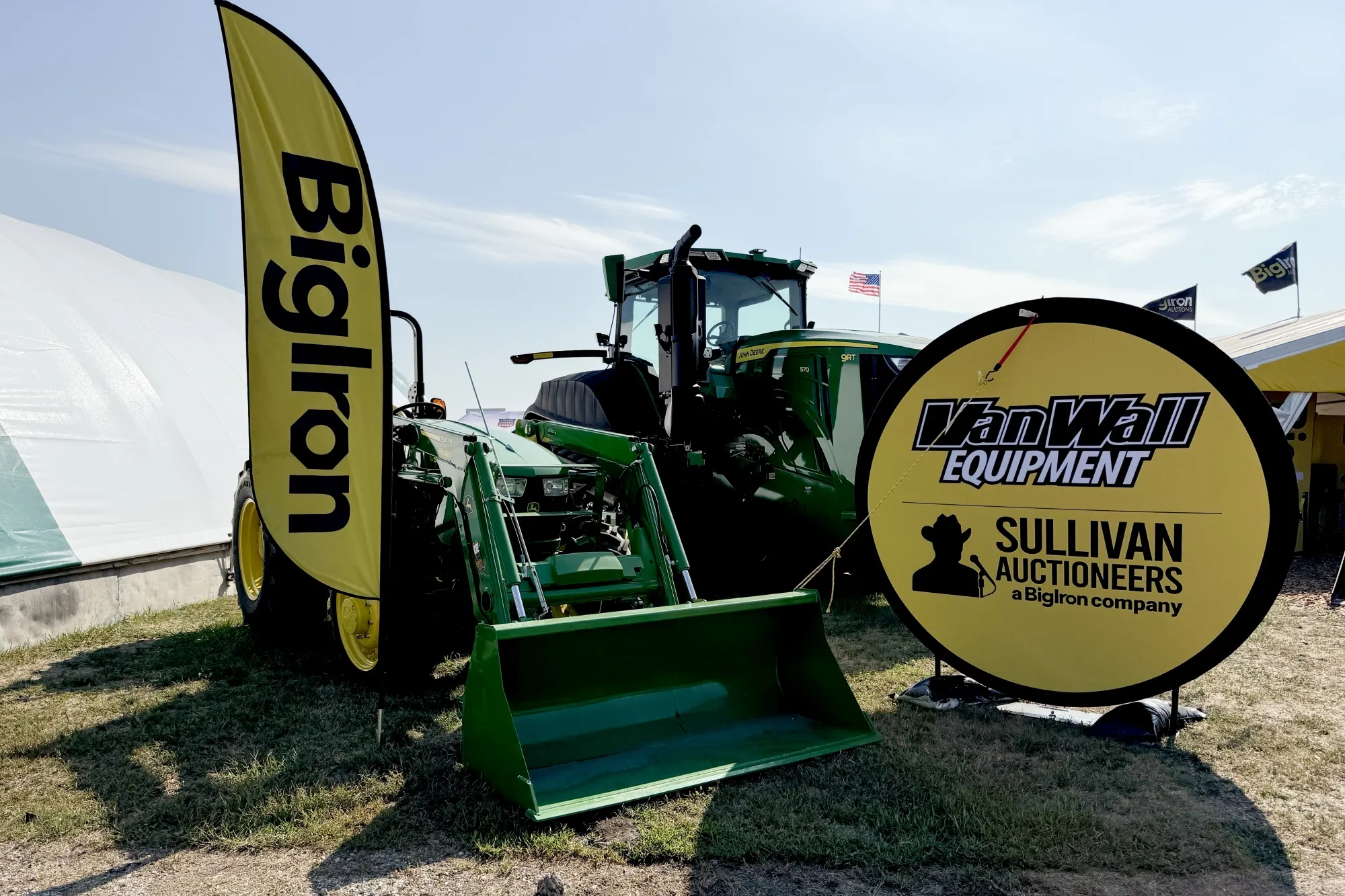 农场进展展览会上,约翰·迪尔公司的农机设备靠近BigIron拍卖标识。摄影师:迈克尔·赫尔策/彭博社我们看到“巨大的兴趣,”马克·斯托克,BigIron首席执行官说。一位来自魁北克的农民购买了一台作物喷雾器,而其他购物者则从阿根廷、巴西和以色列前来,他说。