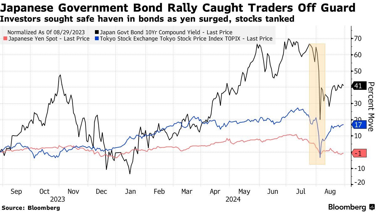 日本股票在8月的前三个交易日中损失了1.1万亿美元,东证指数遭遇自1959年以来最大的崩溃。恐慌的投资者纷纷涌向日本政府债券的安全避风港。加上疲弱的美国就业数据和日本银行政策制定者的保证,表示在不稳定的金融市场中不会进一步加息,打击了对日本利率上升的热门对冲基金押注。基准10年期日本国债收益率下滑幅度为1999年以来最大,因为交易员寻求覆盖空头头寸。