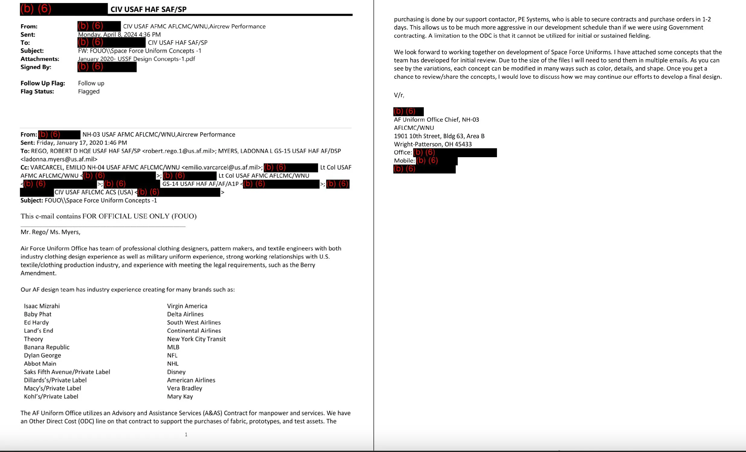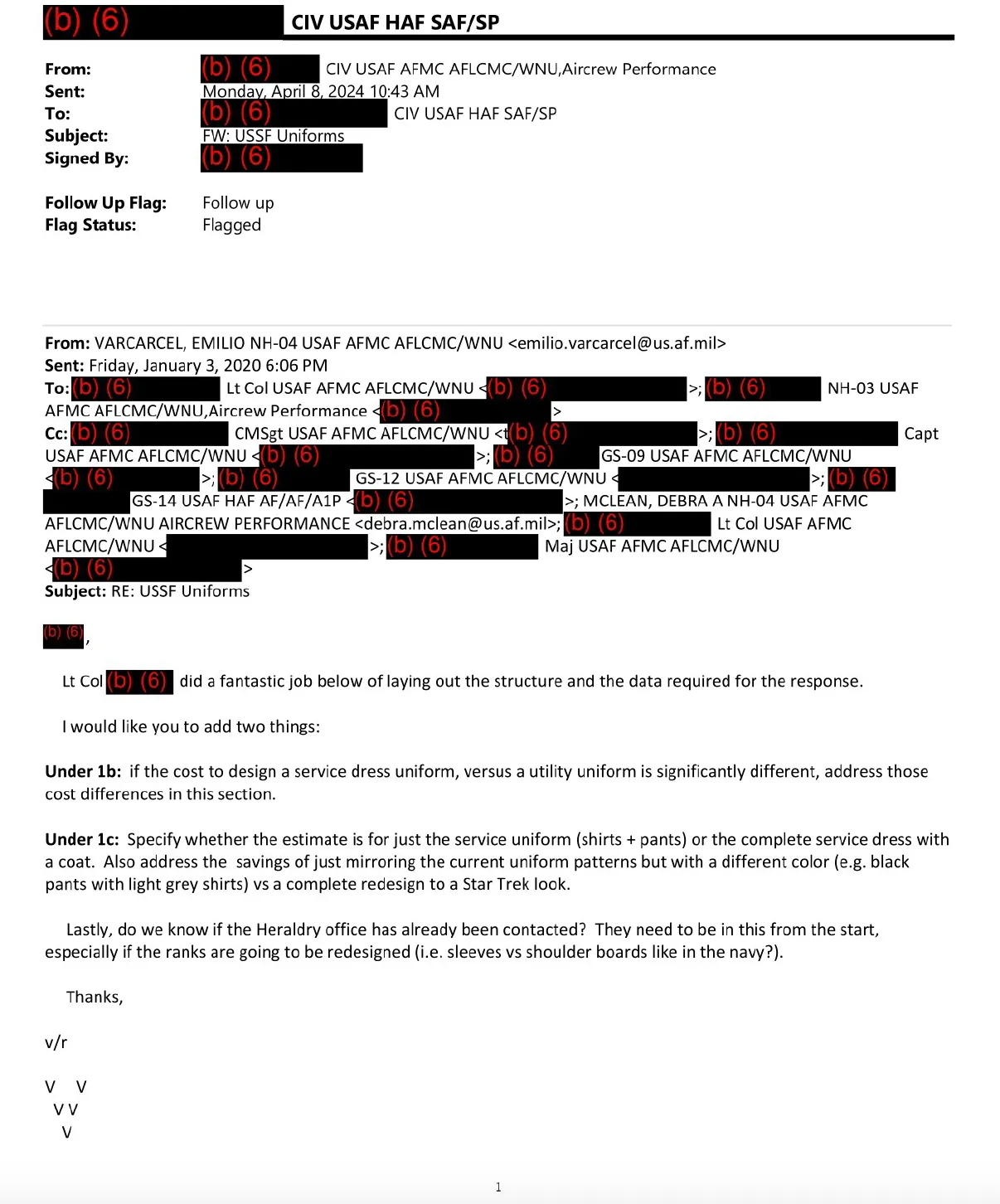 我无法抗拒。我向空军提交了信息自由法案请求,要求获取与制服相关的所有记录。然后四年(令人恼火)过去了,我仍然没有收到任何文件。更糟糕的是,空军忽视了我所有的电子邮件和电话。