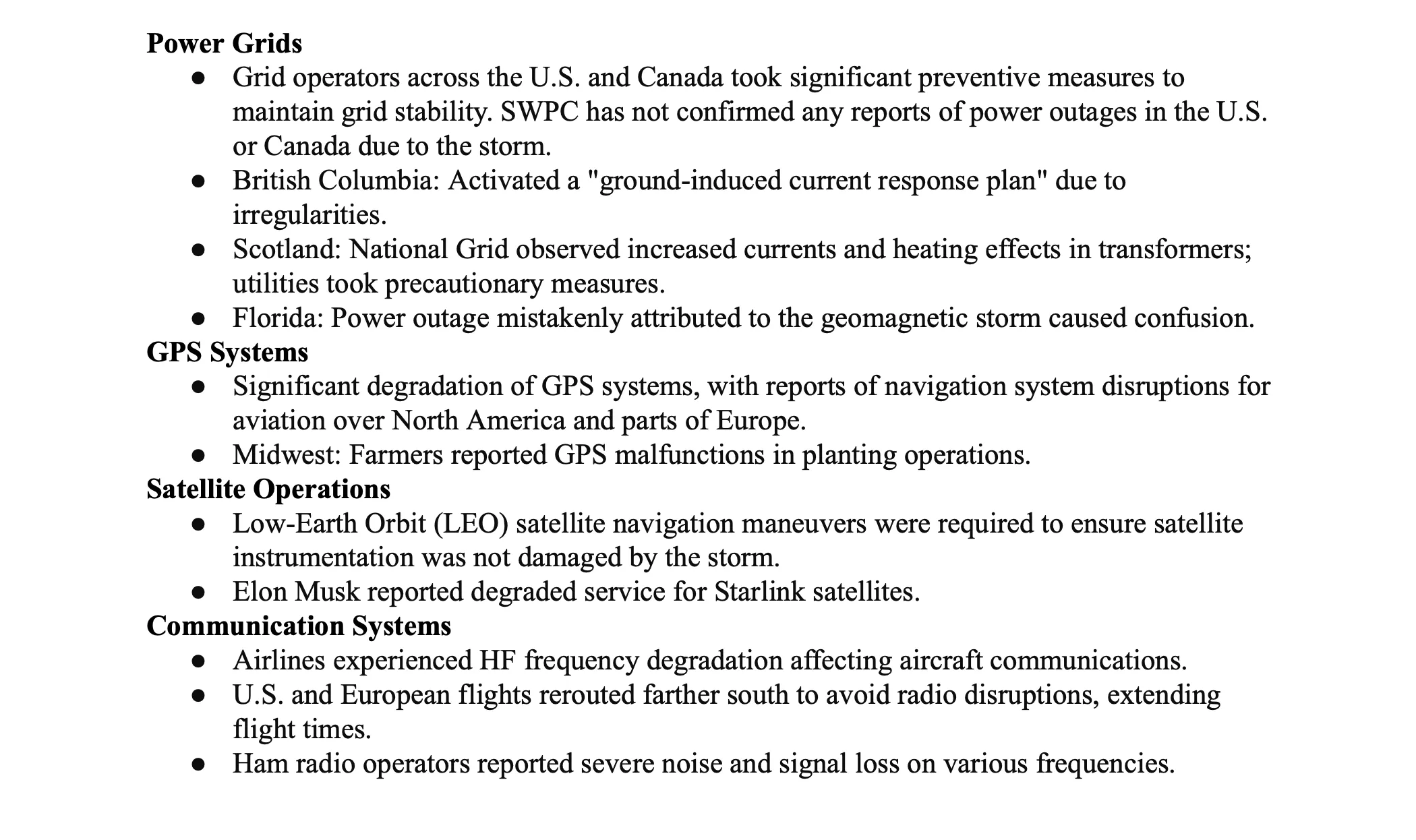 华莱士在他的备忘录中写道,风暴造成了“多个行业的重大干扰,包括导航、电网、航空和卫星操作。”他还指出,地磁风暴的严重性“突显了现代基础设施对太空天气的相互关联性和脆弱性。”
