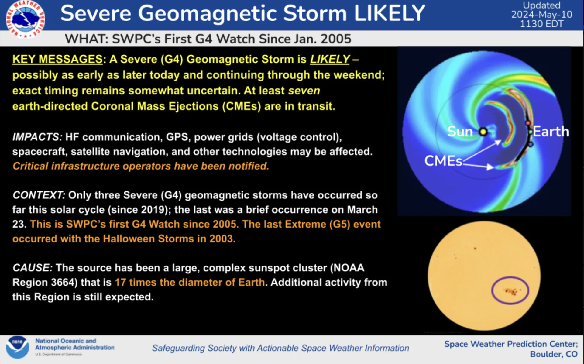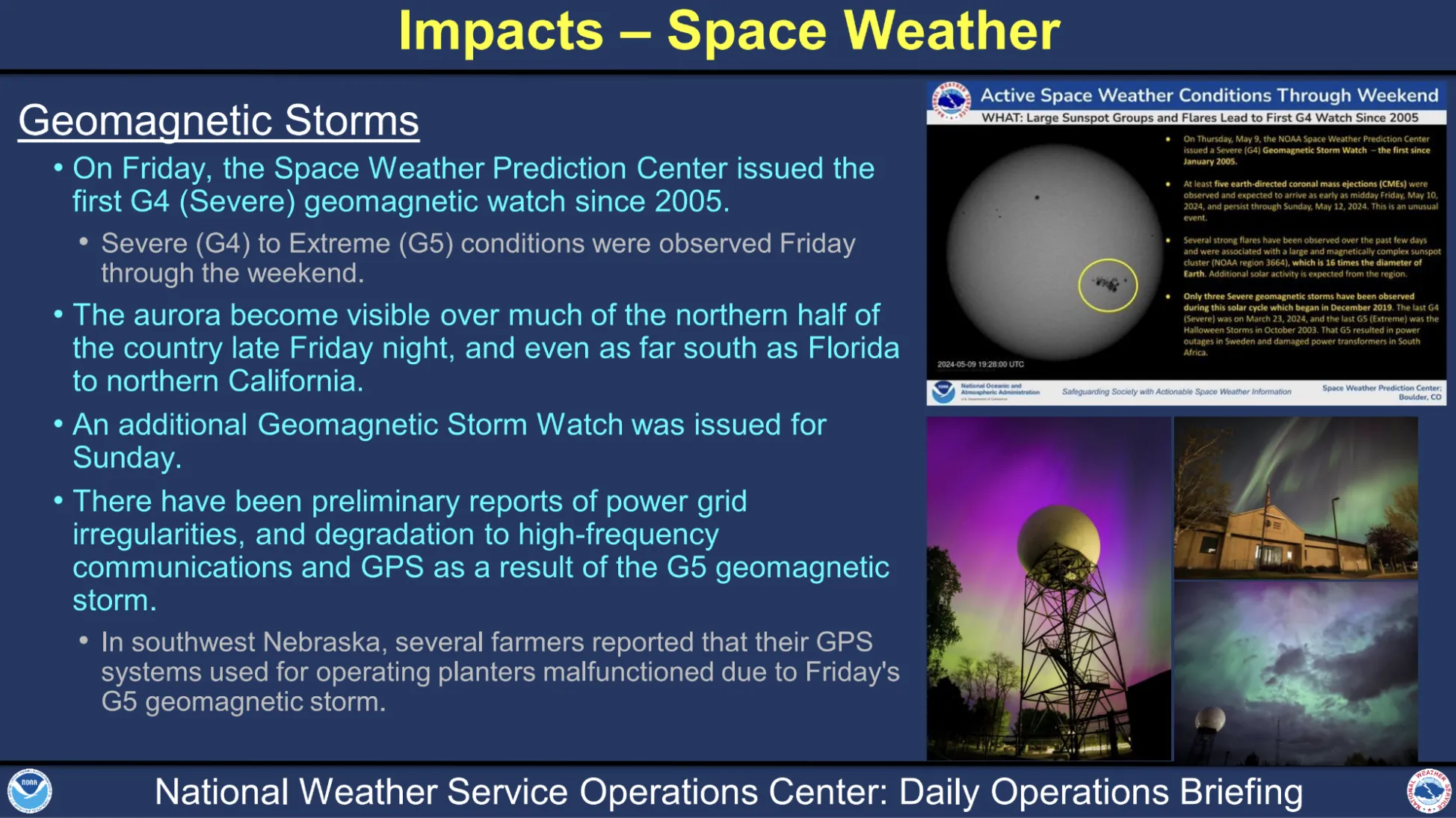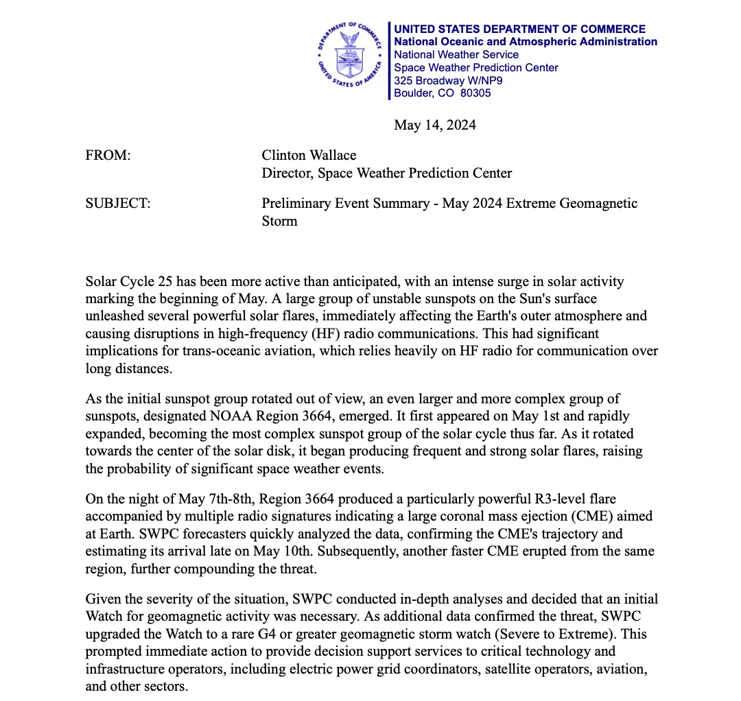 5月14日,太空天气预报中心主任克林顿·华莱士发布了一份三页的行动后备忘录,描述了风暴的影响并解释了这一天文现象。他说“太阳周期25”,这是一个自2019年12月开始并持续到2030年的太阳黑子活动阶段,“比预期更活跃,5月初标志着太阳活动的强烈激增。”