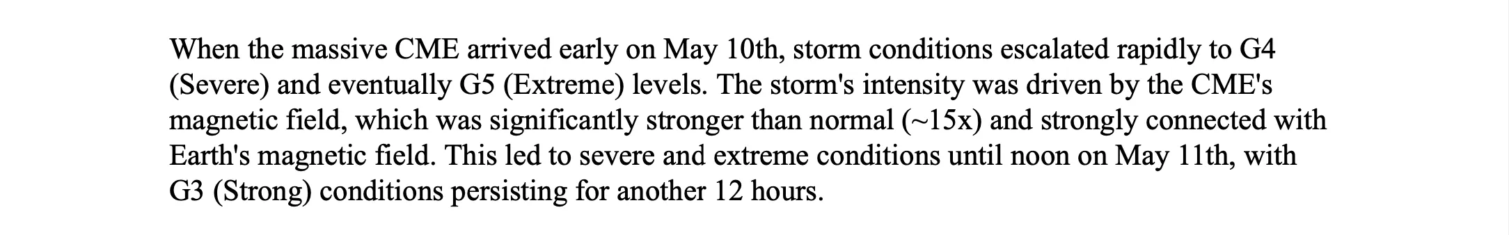 这正是5月10日发生的事情,当时发生了三次“日冕物质抛射”(我未来的金属乐队名称),产生了500年来最强大的太阳风暴之一500年,因此即使在南美洲也能看到令人眼花缭乱的多色天空。结果,极端的太空天气也干扰了地球上的生活。