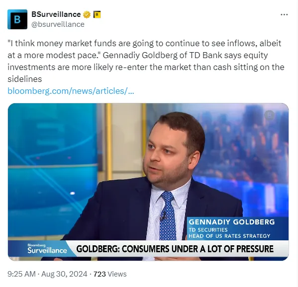 但数据并不支持这一点,至少目前还没有。昨天,彭博社的亚历克斯·哈里斯报道,美国货币市场基金行业在8月份吸引了约 $1270亿的新资本,这是今年最大的月度收入,即使降息预期在增加。