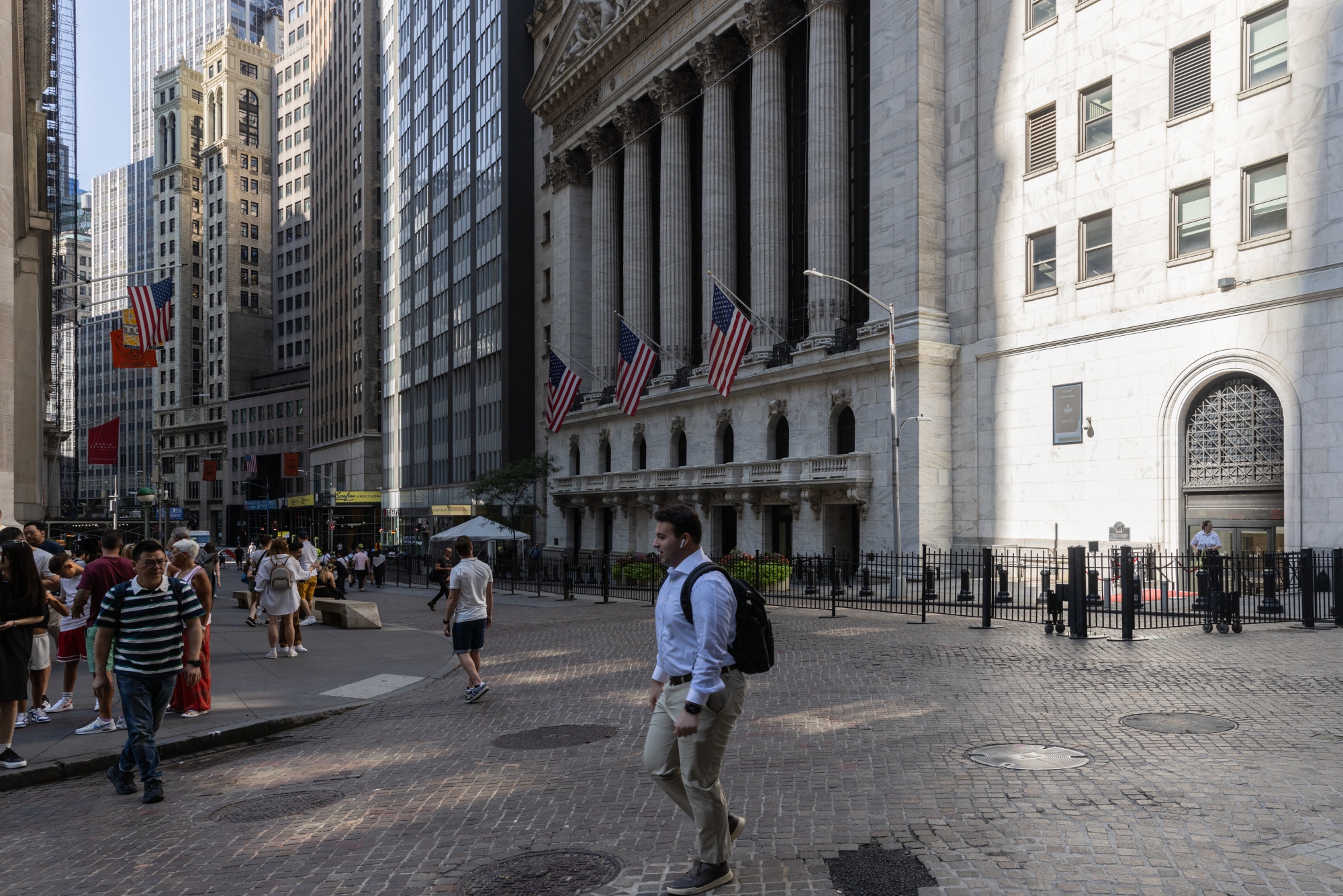 行人于2024年8月27日在纽约证券交易所(NYSE)附近的华尔街上行走。