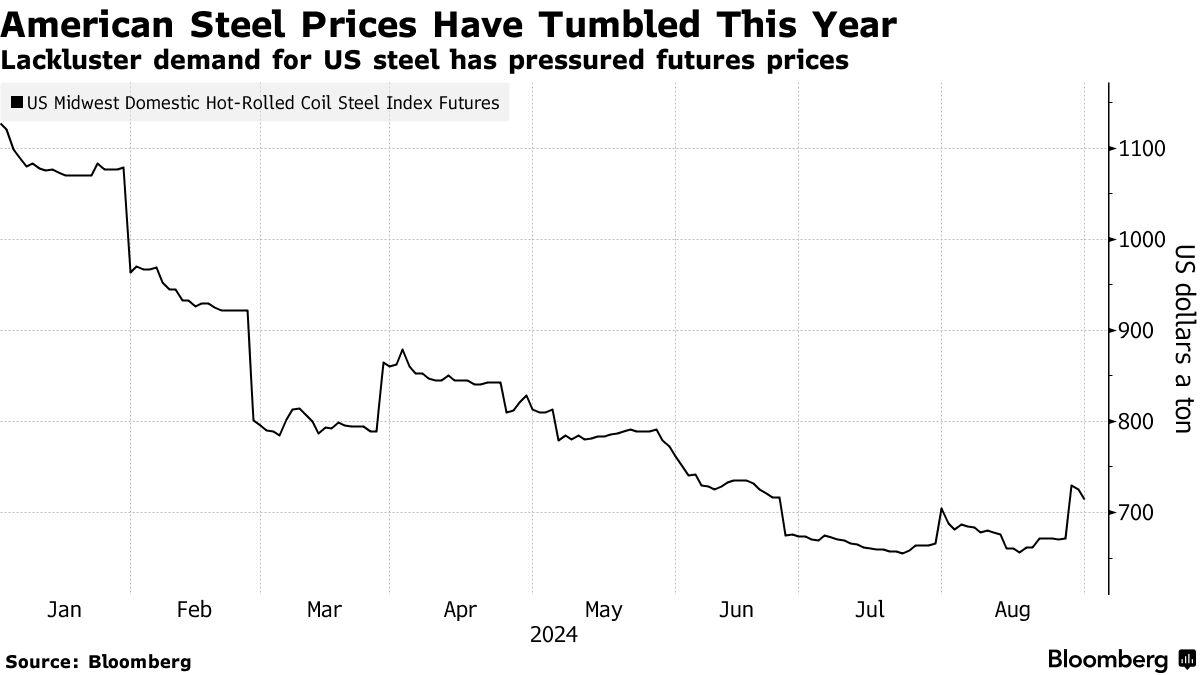基准美国钢铁期货自年初以来下跌了37%,并在夏季早些时候达到了自2022年12月以来的最低水平。