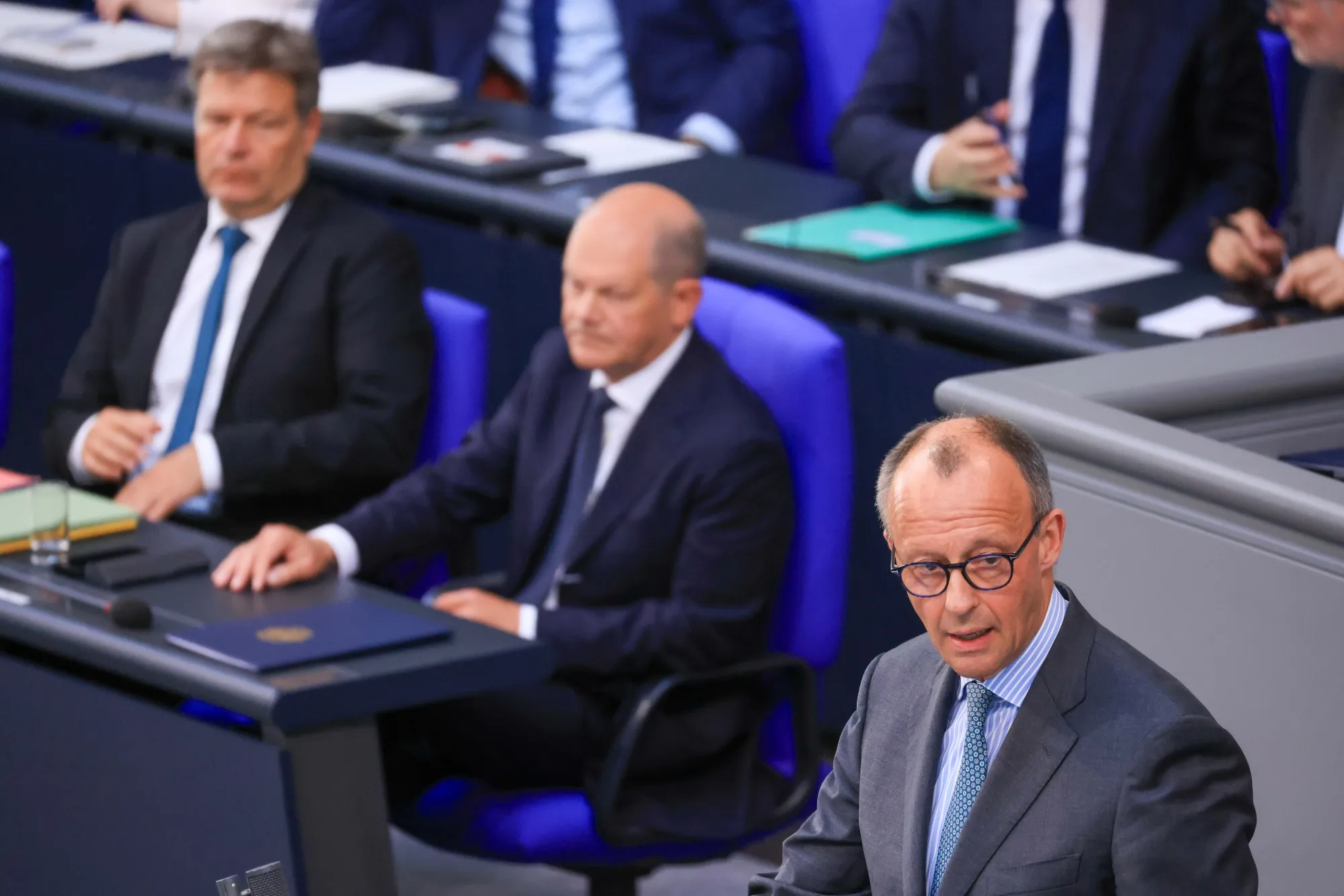 有太多损失的两个人:联邦总理奥拉夫·肖尔茨(中)和基督教民主联盟主席弗里德里希·梅茨(右)在6月26日的联邦议会。照片:克里斯蒂安·博奇/Bloomberg但这也是肖尔茨对基督教民主联盟主席弗里德里希·梅茨的反应,后者试图通过自己更严厉的措施清单来推动总理,并在红绿灯联盟中制造分歧。然而,梅茨在批评者看来,实际上是过于激进——例如,他要求对叙利亚人和阿富汗人实施全面的接收停止。