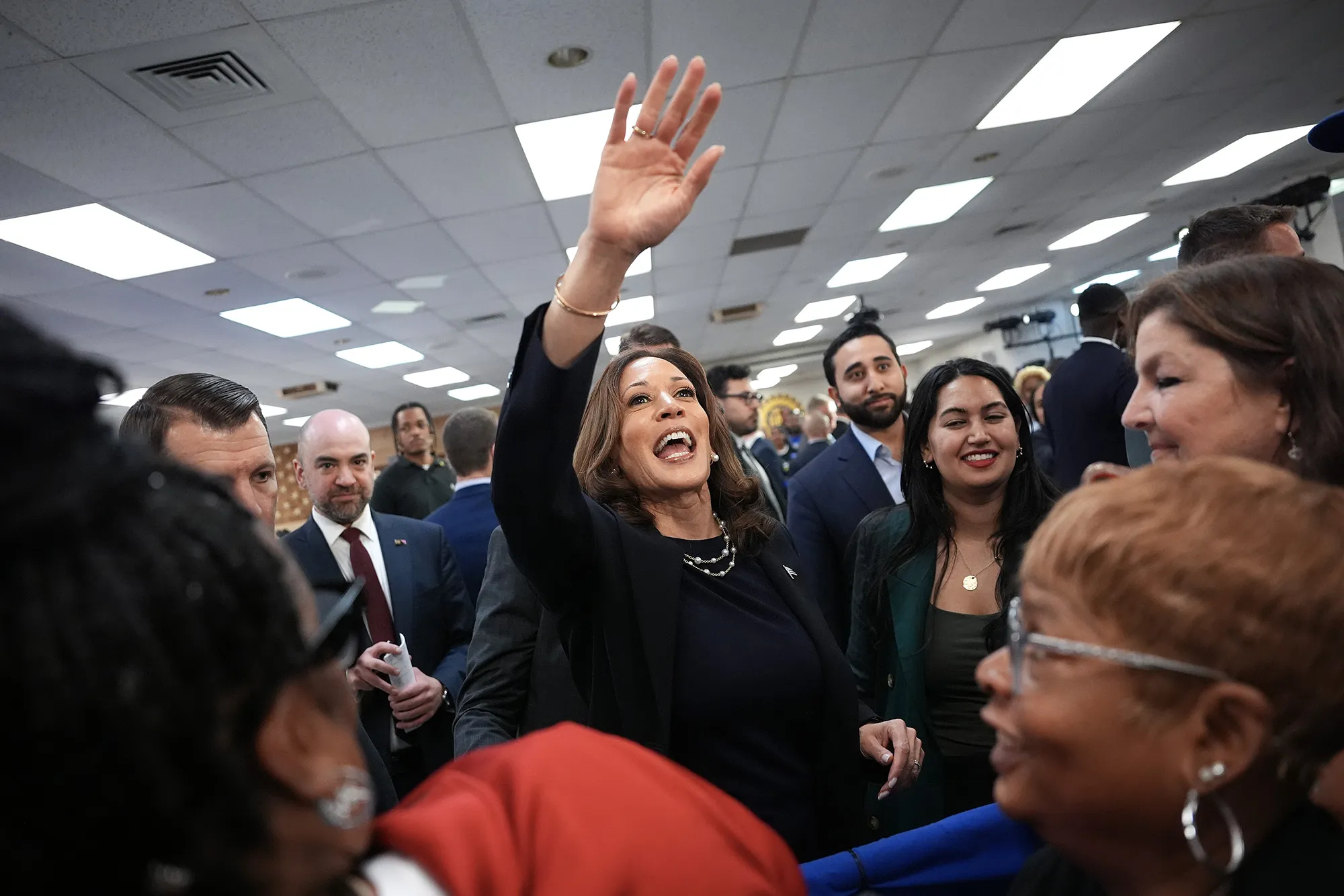 卡马拉·哈里斯在密歇根州韦恩的联合汽车工人900号分会的竞选集会上向观众问好,时间是8月8日。摄影师:安德鲁·哈尼克/盖蒂图片社卡马拉·哈里斯寄希望于工会的支持,以帮助她在11月取得胜利。工会领导人纷纷表示愿意支持,尽管她尚未明确说明她将如何追随被誉为几代人中最支持工人的总统。