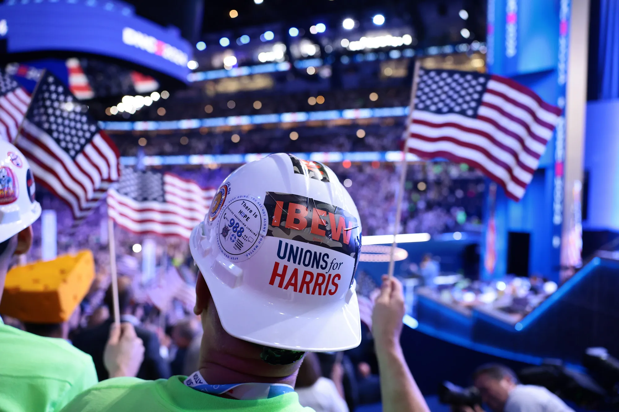 工会成员在8月22日于芝加哥联合中心举行的民主党全国大会上挥舞着美国国旗。摄影师:汉娜·贝尔/彭博社在匹兹堡,哈里斯进入了另一个工会争议问题:提议以141亿美元将 美国钢铁公司 出售给 日本的日本钢铁公司。 美国钢铁工人联合会强烈反对这一收购。拜登表示该公司将“保证”保持美国所有权,但并未停止交易。特朗普表示他会阻止这一交易。哈里斯尚未表明她的立场。