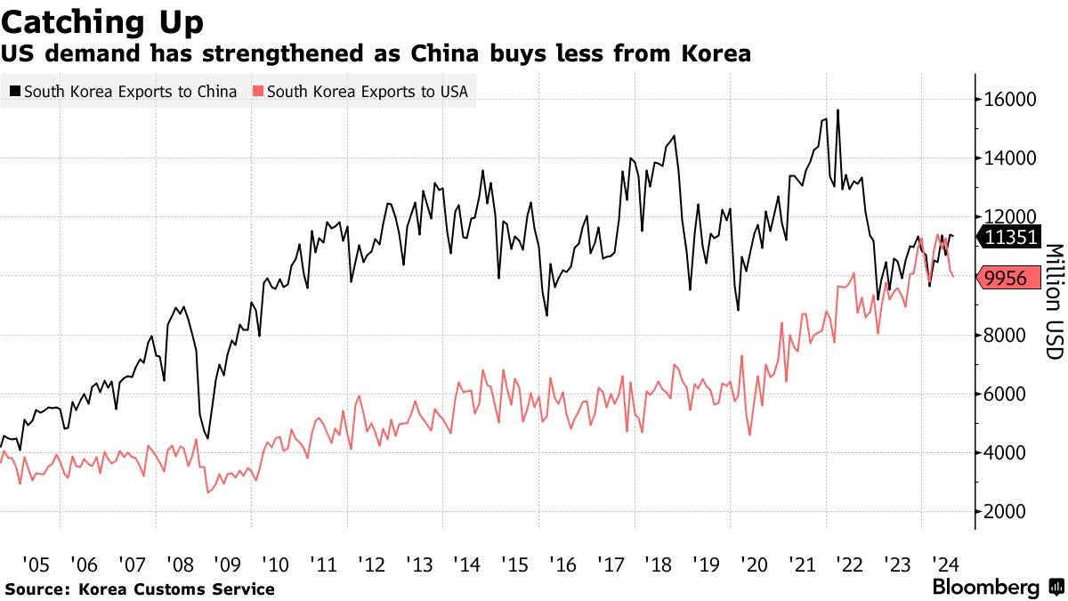 虽然美国在对韩国产品的整体需求方面在很大程度上赶上了中国,但7月份贸易的细分数据显示,几乎一半的对中国的出口由芯片和其他电气设备组成。与此同时,这些产品仅占韩国对美国出货量的18%,根据金在贤在美国韩国经济研究所的说法。这意味着美国在芯片需求方面能否成为强有力的替代者仍不清楚。