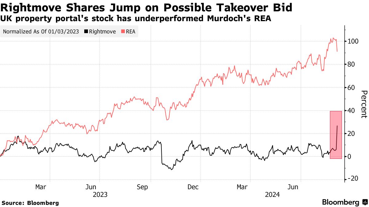 周一,Rightmove的股价在伦敦飙升27%,创下有记录以来的最大单日涨幅,使其市值达到56亿英镑(73亿美元)。REA在悉尼下跌5.3%,为2022年12月以来最大跌幅,市值为274亿澳元(186亿美元)。