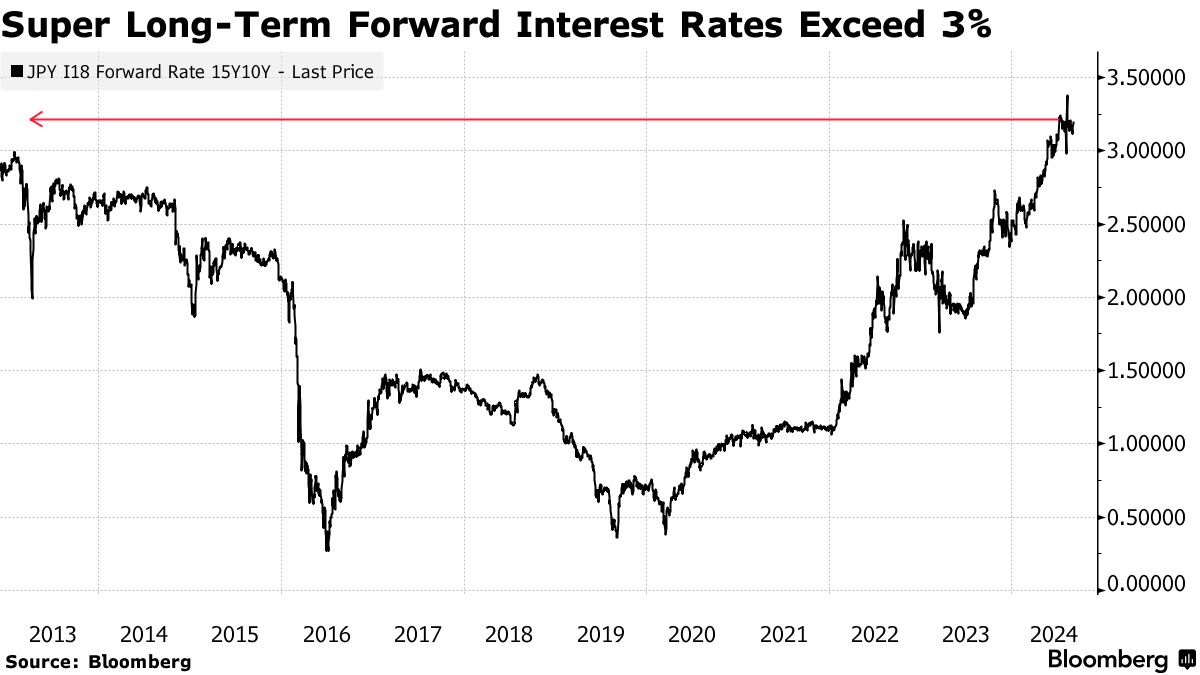 超长期债券的远期利率首次超过3%,这是自2013年日本银行实施激进的量化宽松以来的首次。收益率曲线仍然陡峭,Kakuchi表示,“没有购买长期政府债券的期限需求。这是一个承担一点风险的机会。”