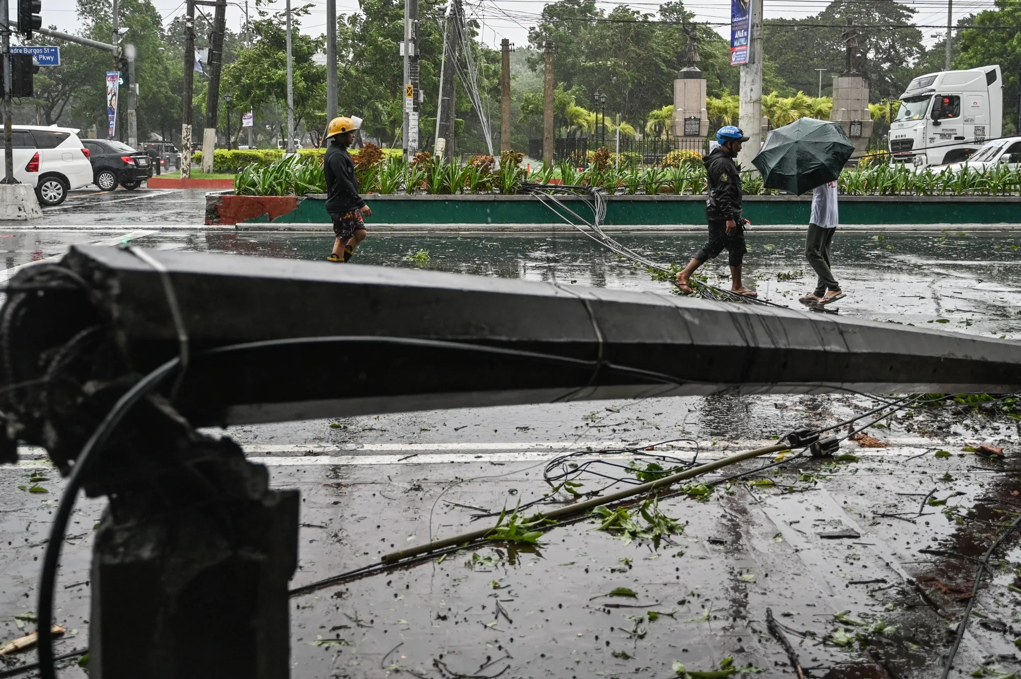 9月2日,强风导致的热带风暴雅吉在马尼拉倒下的电线杆。摄影师:Jam Sta Rosa/法新社/盖蒂图片社至少有九人在黎萨尔省及大马尼拉东南部地区的其他地方遇难,因持续不断的降雨引发了山洪和滑坡,警方表示。还有三人在比科尔地区遇难,另外三人在中部和西维萨亚因溺水、电击或因墙壁倒塌造成的伤害而遇难,相关部门表示。