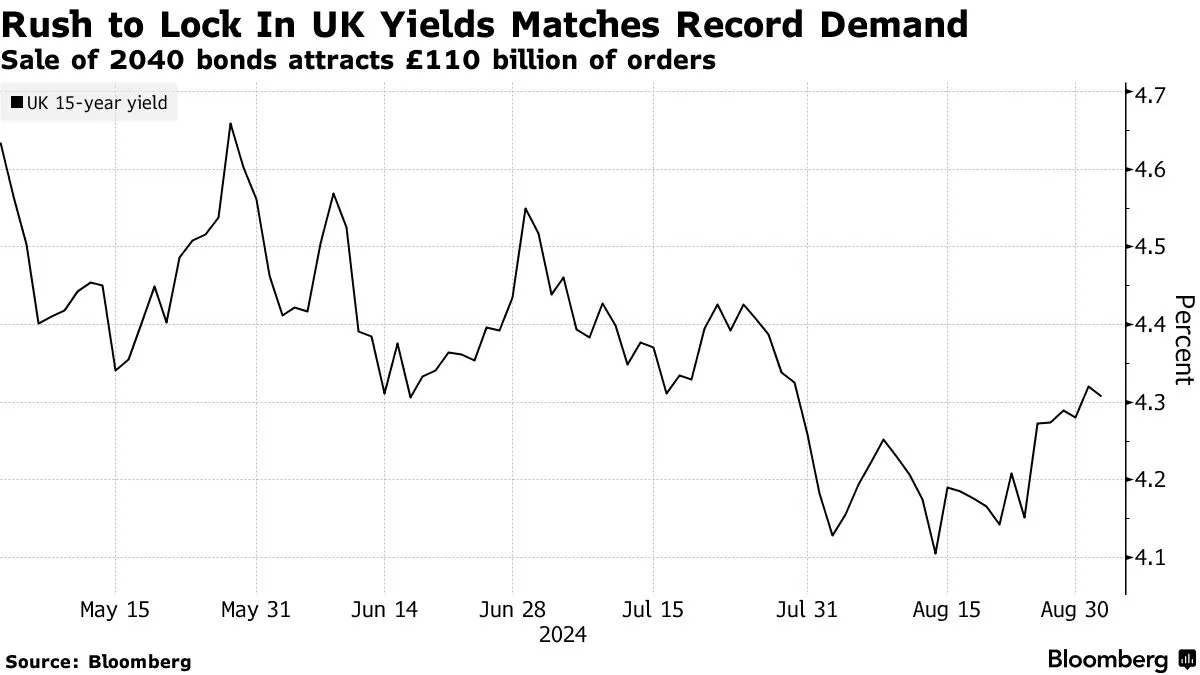 一项新的英国债券销售吸引了创纪录的1100亿英镑订单,显示投资者对政府债务的需求依然强劲,这是在工党大胜之后的迹象。