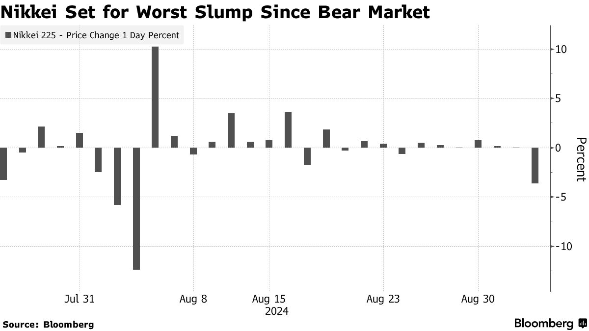 日本股票正朝着自一个月前进入熊市以来最严重的下跌,华尔街的暴跌和日元走强抑制了对该国主要出口商的需求。