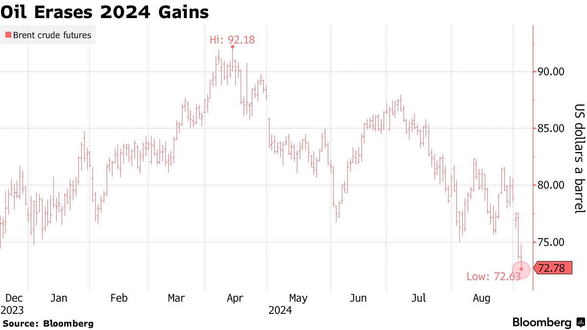 原油现在已经抹去了今年所有的涨幅。精炼产品市场引领了疲软,纽约的汽油期货周二下跌11%,跌至自2021年12月以来的最低点。这个趋势可能会为副总统卡马拉·哈里斯提供及时的选举助力,因为油价是选民最直观的通胀指标之一。