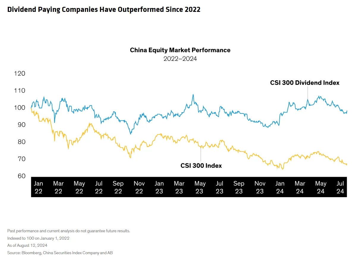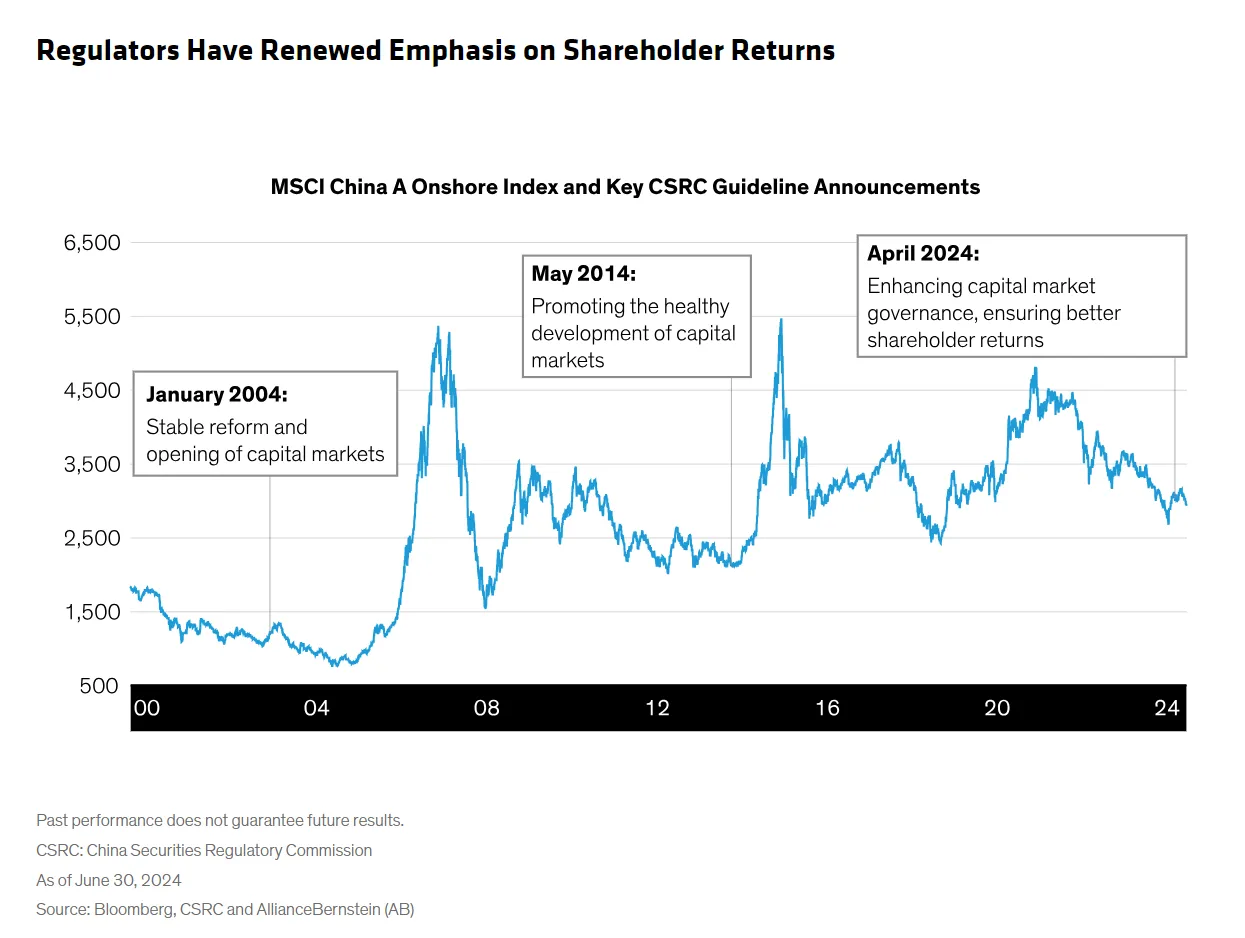 此外,中国证券监督管理委员会促使公司向股东返还现金可能会为股权投资者释放价值。AllianceBernstein的分析师John Lin和Stuart Rae将4月份发布的法规描述为“重大转变”,这可能有效推动股息支付的增加。历史上,类似的监管指令与某种程度的市场超额表现相吻合,尽管没有保证会出现类似的结果: