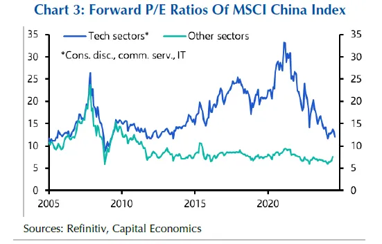 自疫情以来,世界第二大经济体一直时冷时热,领导层提出了一系列政策以复苏经济,但至今似乎没有一项政策达到预期效果。回报点详细报道了其中一些政策在这里和这里。在这种低迷之下,其他因素显而易见。中国科技估值在人工智能热潮带动的良好表现中处于观望状态。正如Capital Economics的Hubert de Barochez所指出的,MSCI中国指数中IT、通信服务和消费品可选行业的12个月前瞻性市盈率(P/E)现在大约是2021年初峰值的三分之一。中国股市其他部分的市盈率相对稳定: