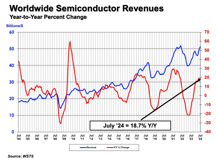 **半导体需求:**抛售的震中在芯片股票中,确实在华尔街开盘前有一些来自该行业的消息。全球销售在7月相比6月仅增长了2.7%。但从世界半导体贸易统计的这张图表来看,没有 compelling 的理由在这些证据下抛售该行业: