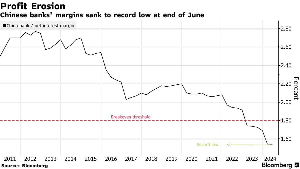 中国监管机构在努力支撑疲软的房地产市场和经济的同时,试图保护国家66万亿美元的金融系统,正走在一条微妙的平衡线上。过于激进地降低利率将给银行带来压力,而银行的利润率截至6月底已跌至创纪录的1.54%,远低于被认为维持合理盈利所需的1.8%阈值。