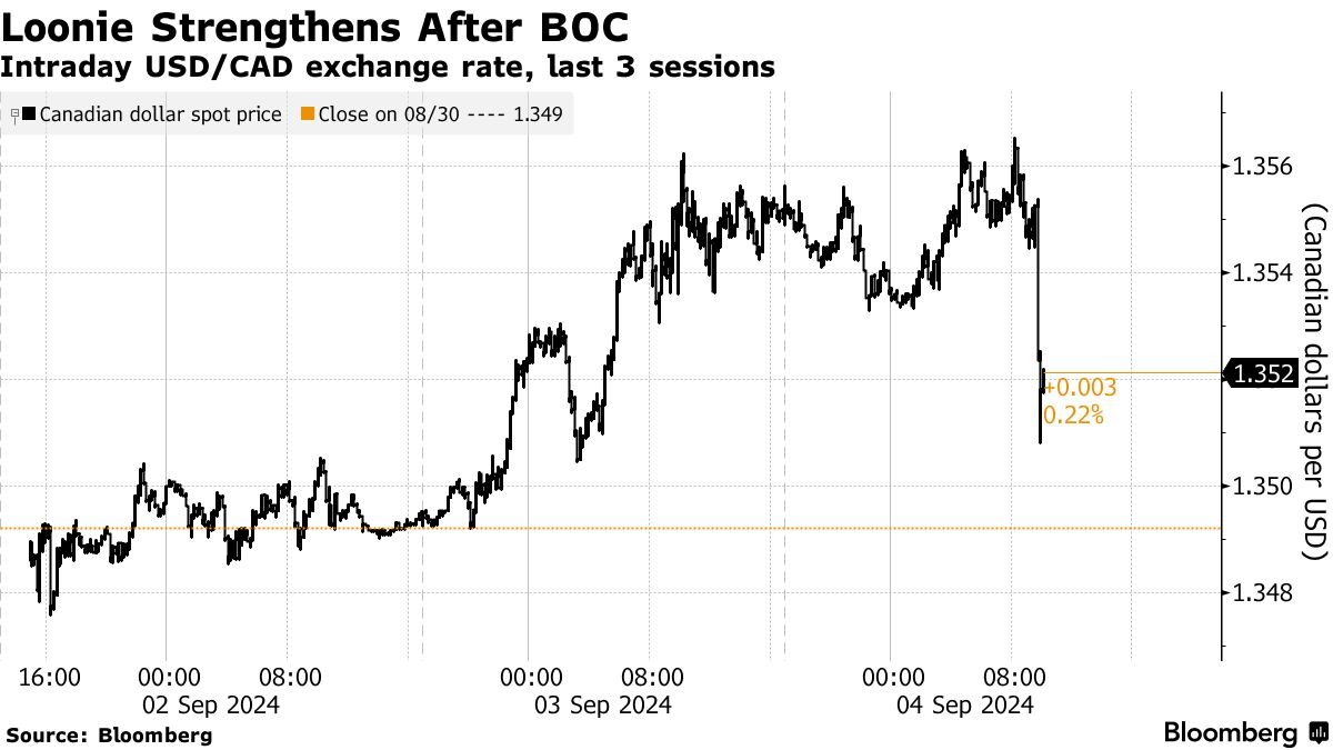 在决定公布后,加元上涨约0.3%,随后回落了一些涨幅。截至渥太华时间下午1:20,加元兑美元的交易价格为C$1.352。加拿大的两年期收益率降至两年低点3.162%,当天下降约八个基点。