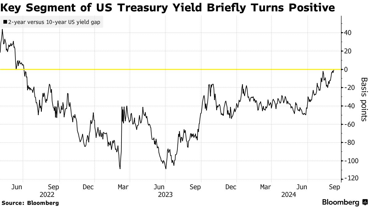 美国国债收益率曲线的一个关键部分短暂转为正值,因为低于预期的劳动力市场数据增强了对美联储大幅降息的押注。