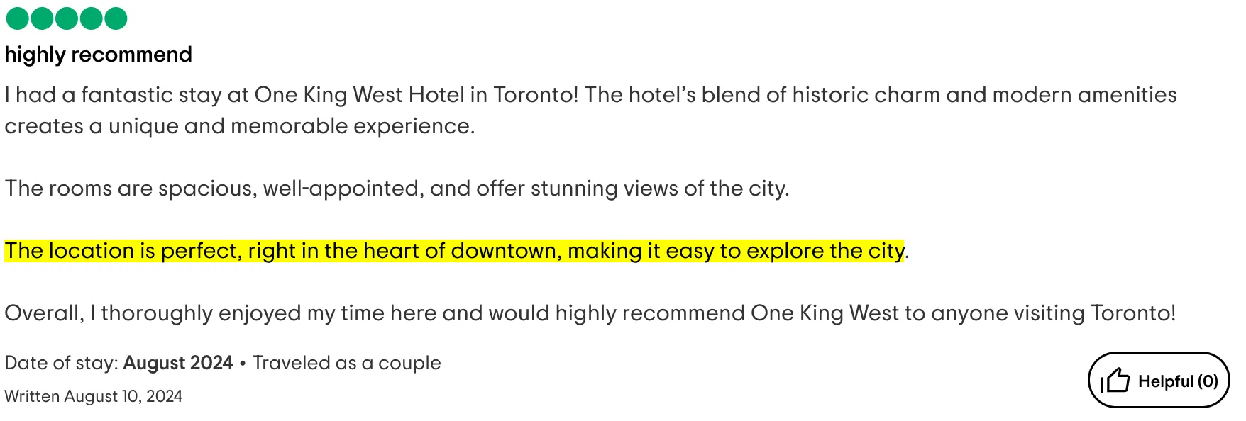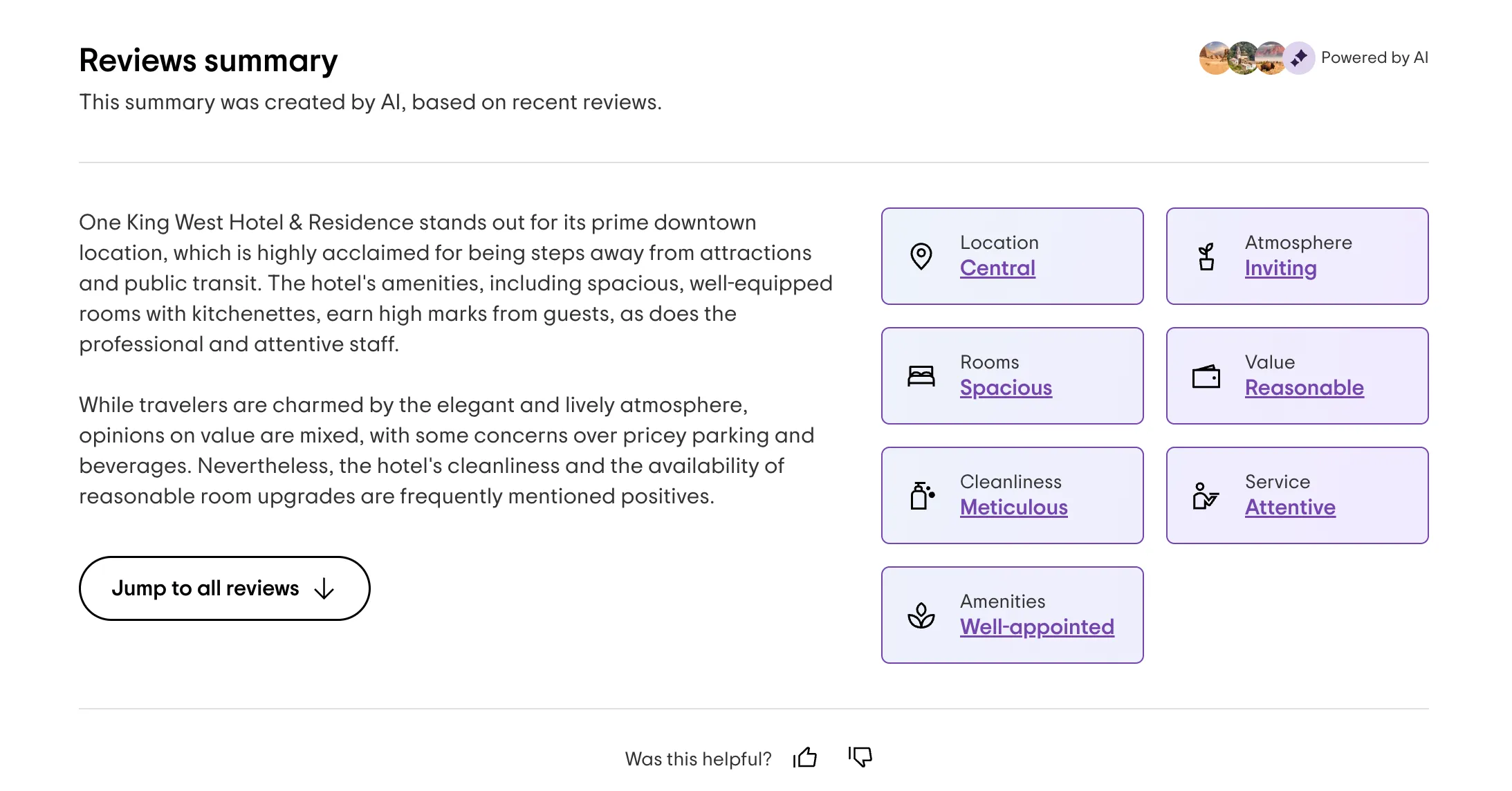 大型科技公司正在忙于开发人工智能,其他许多公司也是如此。但到目前为止,在数千亿美元的投资之后,我们所能明显辨别的只是数字产品可用性的边际提升。例如,互联网旅行网站Trip Advisor显著宣传其酒店评论中使用人工智能,在酒店评论的摘要顶部标注“由AI驱动”。基本上,它会在数百条酒店或餐厅的评论中找到共同点,并总结出突出的亮点。然后,它会突出那些符合这些特征的个别评论中的段落。你可以在这里看到我随机选择的多伦多一家酒店的示例。