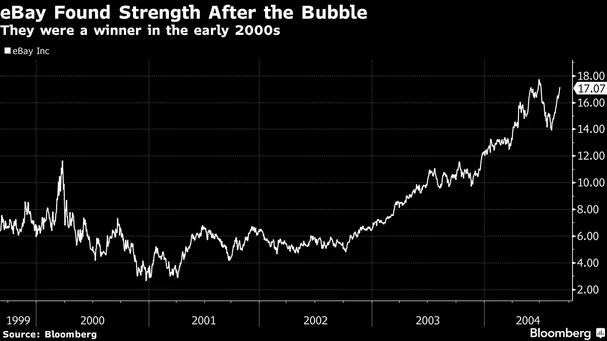 eBay在互联网泡沫破裂时刚刚起步,永远没有机会达到亚马逊的同样高度。因此那只股票是相对赢家。到2004年秋季,股价比2000年的峰值高出近50%。不过,即便如此,你也得等上几年才能看到反弹的发展。