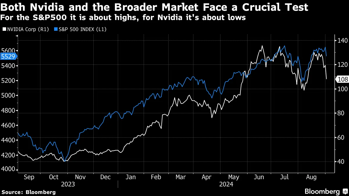 问题在于,英伟达——所有这些人工智能建设支出的主要受益者——直到现在一直在推动市场上涨。它可能面临一个考验,即是否会收盘低于100美元,这是它在上个月初短暂突破的一个水平。如果是这样,动能可能会使股票大幅下跌。对于一个试图创下新高的标准普尔500指数来说,这几乎是致命的打击,因为英伟达占该指数的约6%。