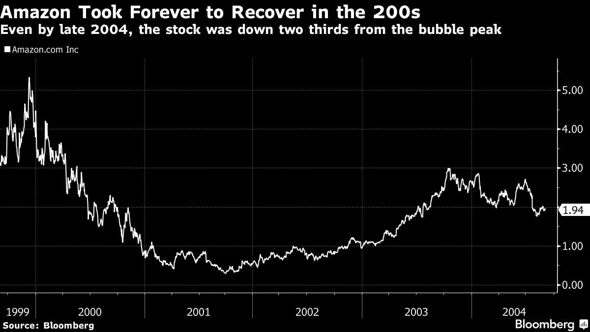 因此,衰退将是一个问题,尤其是对于那些失去工作的人来说。对于个别股票来说,无法逃避下行压力。像亚马逊这样的明显互联网赢家在弥补损失时仍经历了可怕的时期。你会在一只从1999年峰值下跌约三分之二的股票上坚持下去吗,几乎五年后?
