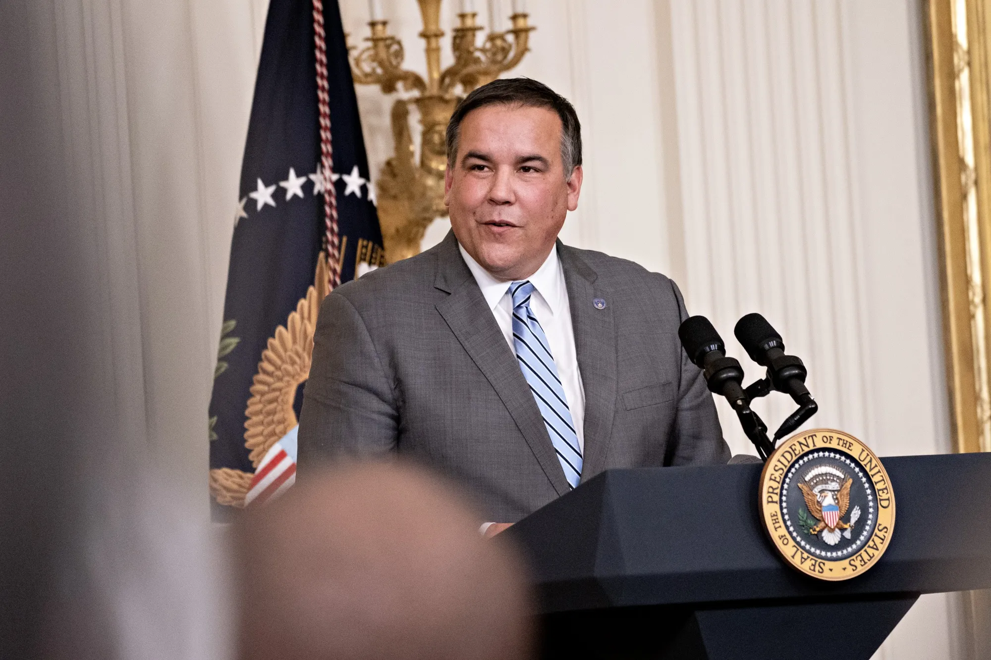 安迪·金瑟,俄亥俄州哥伦布市市长,在白宫的一次活动中发言。