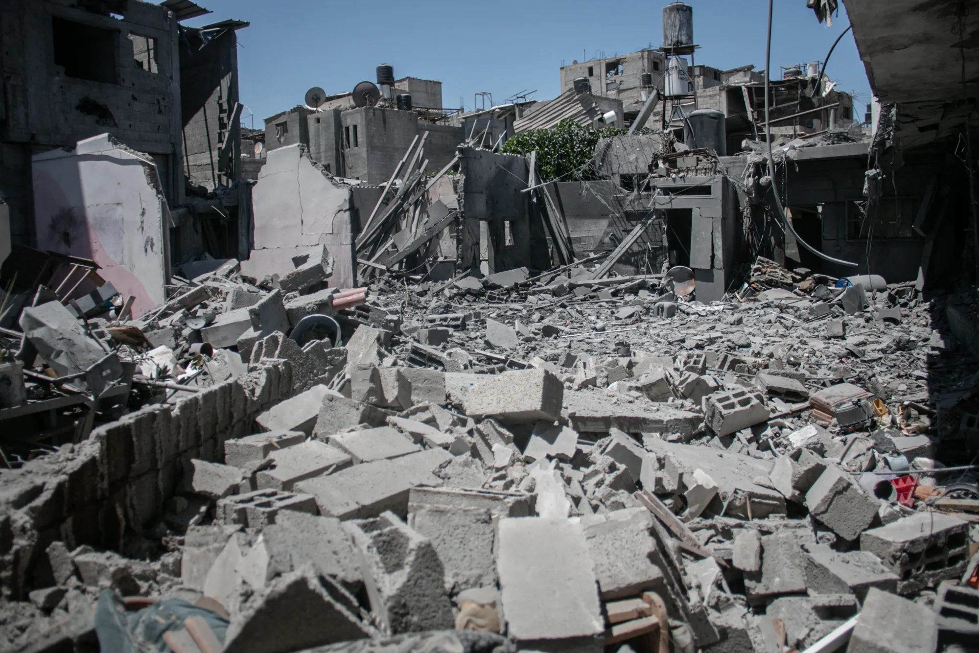 以色列在加沙中央的阿尔布雷杰难民营进行攻击后摧毁的建筑。
