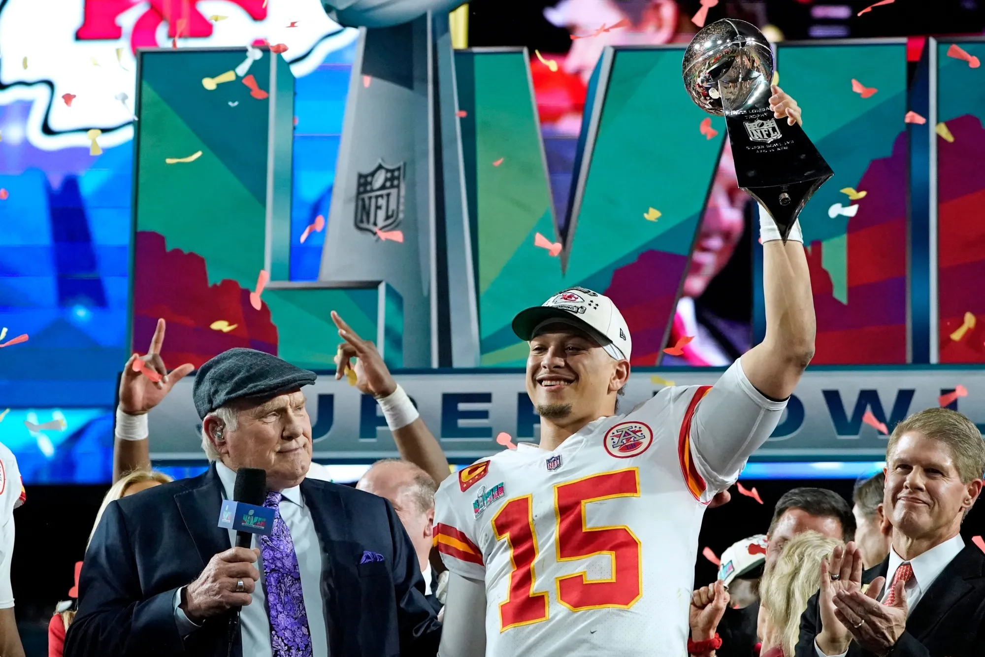 退役足球运动员特里·布拉德肖和堪萨斯城酋长队老板克拉克·亨特观看四分卫帕特里克·马霍姆斯庆祝他球队在2023年2月12日的超级碗胜利。摄影师:蒂莫西·A·克拉里/盖蒂图片社
