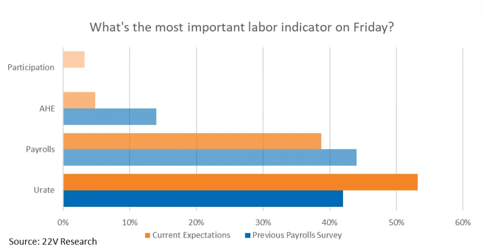 由22V研究进行的一项调查显示,大多数投资者(44%)认为市场对周五数据的反应将是“风险偏好”,27%表示“风险规避”,29%认为“微不足道/混合”。
