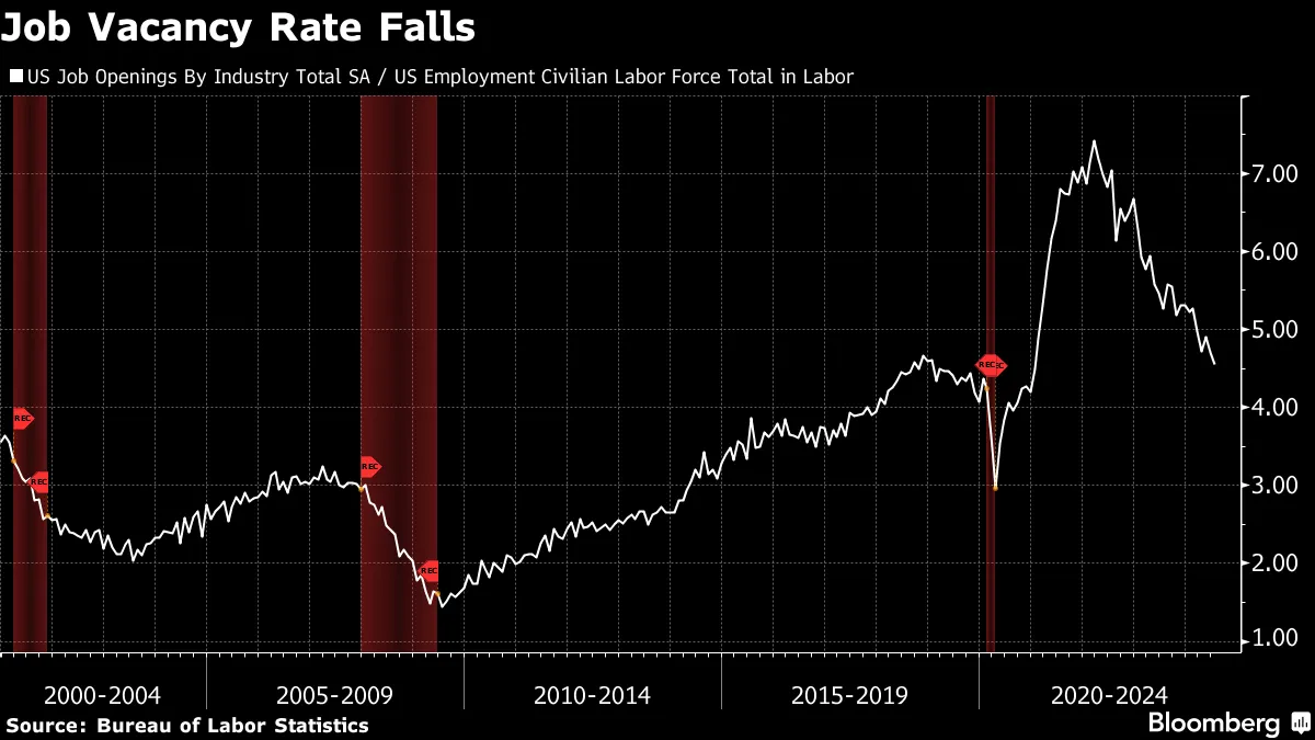 但他与安德鲁·菲古拉于2022年发表的研究论文也显示,一旦职位空缺率降至疫情前的4.6%水平,失业率将上升至4.5%。(7月份的失业率为4.3%)。这一线在周三被突破,当时JOLTS报告显示7月份的职位空缺率降至4.56%,低于2022年3月的7.4%的峰值。