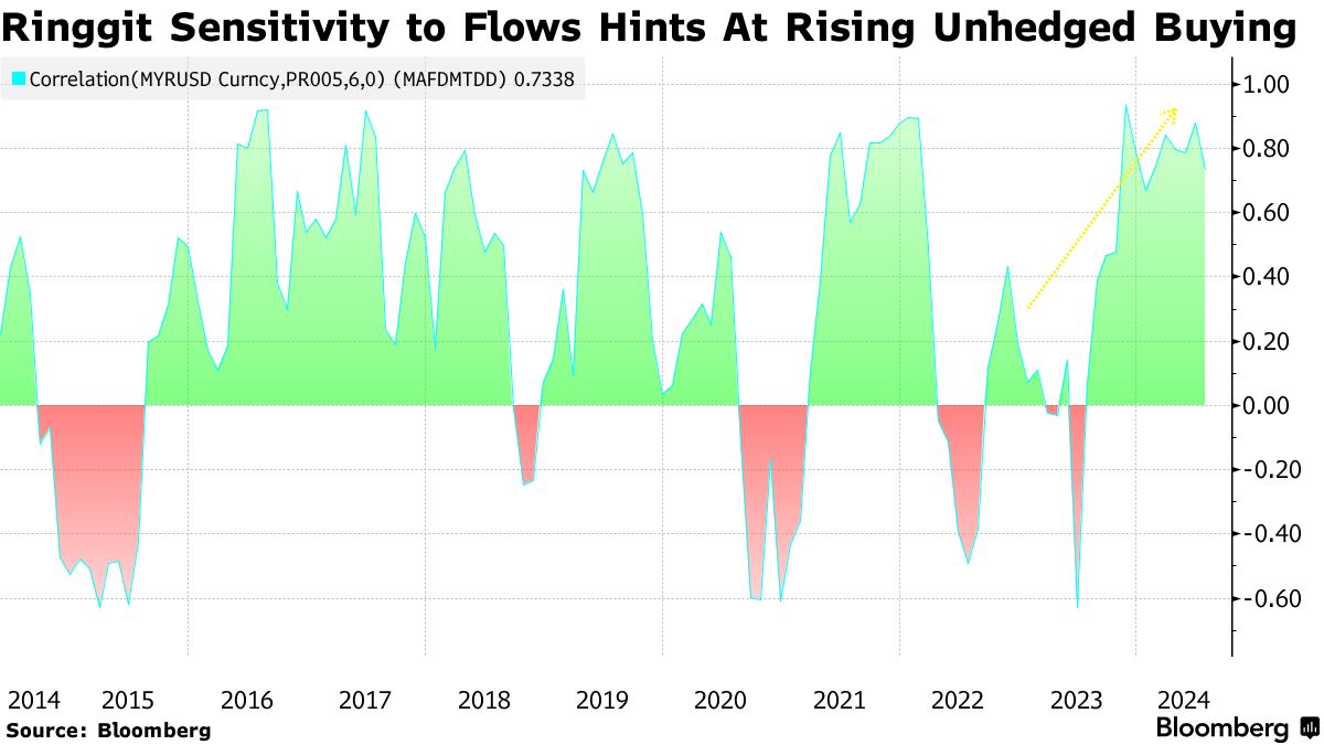 马来西亚债务的外国资金流入指数与林吉特之间的相关性在过去六个月中变得更强,表明未对冲购买的增加。