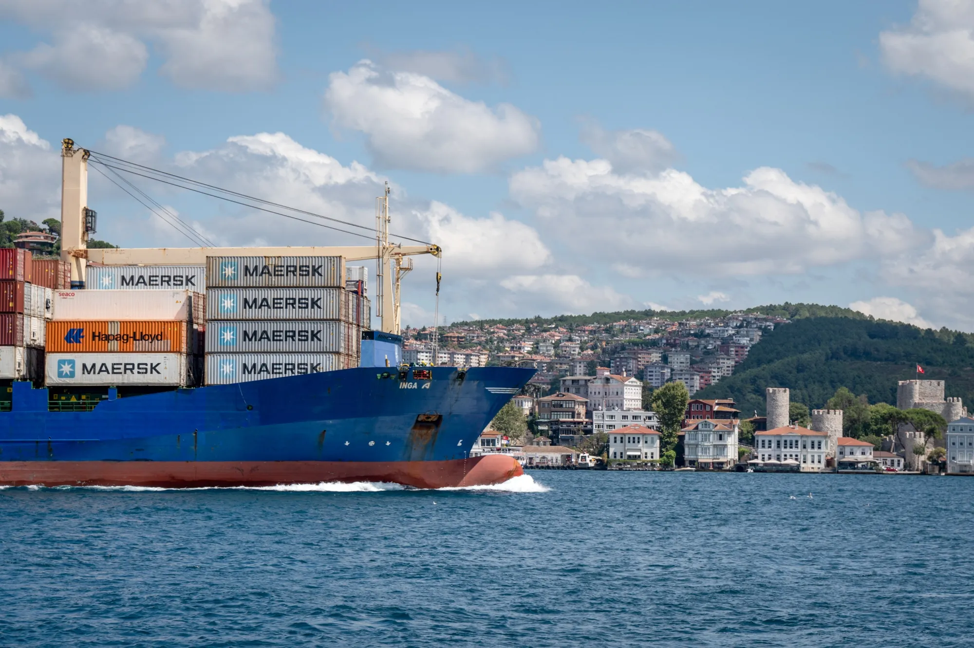一艘集装箱船在伊斯坦布尔的博斯普鲁斯海峡。