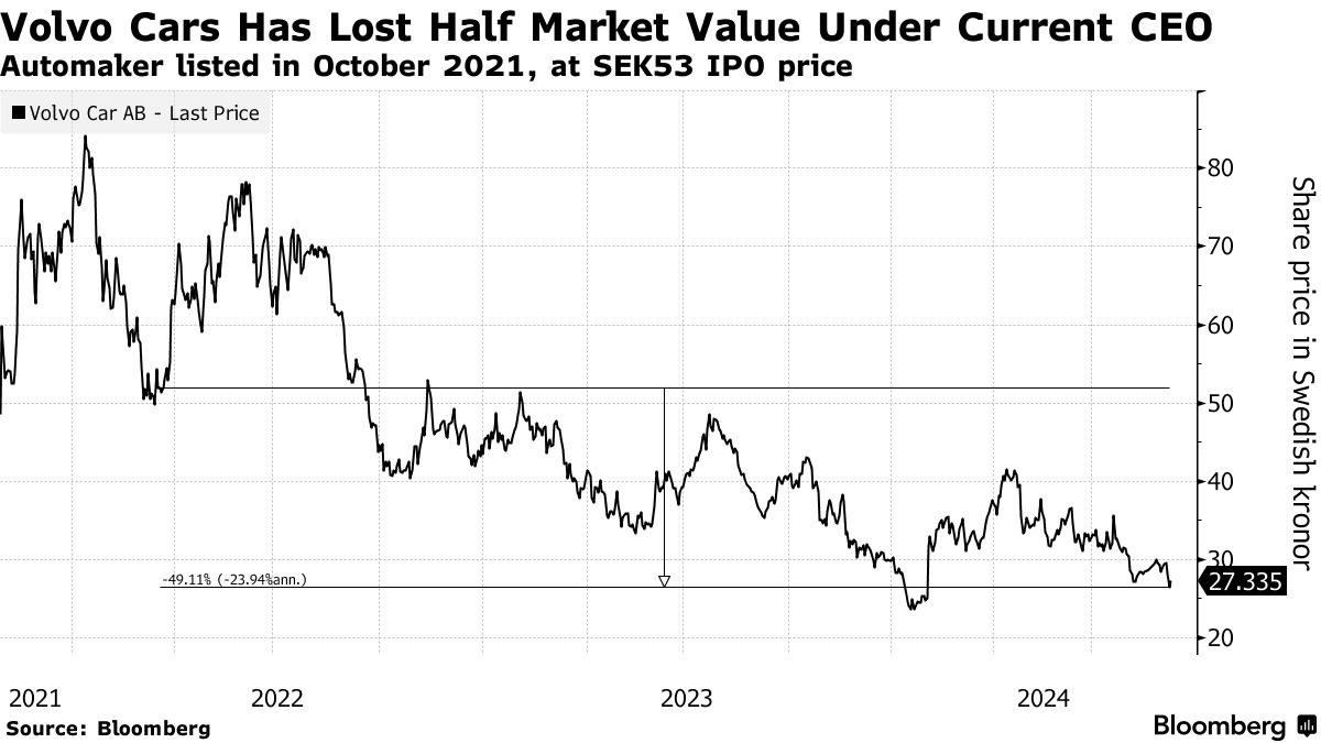 电动车的放缓增加了沃尔沃的压力,该公司回顾了在中国亿万富翁李书福的领导下成功的转型,他于2010年从福特汽车公司手中收购了这个瑞典品牌。该制造商还卷入了与北京之间关于电动车补贴的贸易冲突。