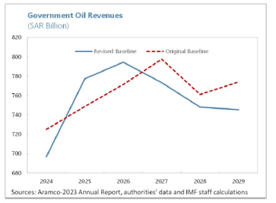 根据国际货币基金组织的报告,预计沙特阿拉伯今年的石油产量为每日900万桶,预计到2026年将上升至1020万桶,到2029年将达到1100万桶。该机构假设王国的平均出口价格在2024年为每桶82.5美元,到十年末将降至70美元。