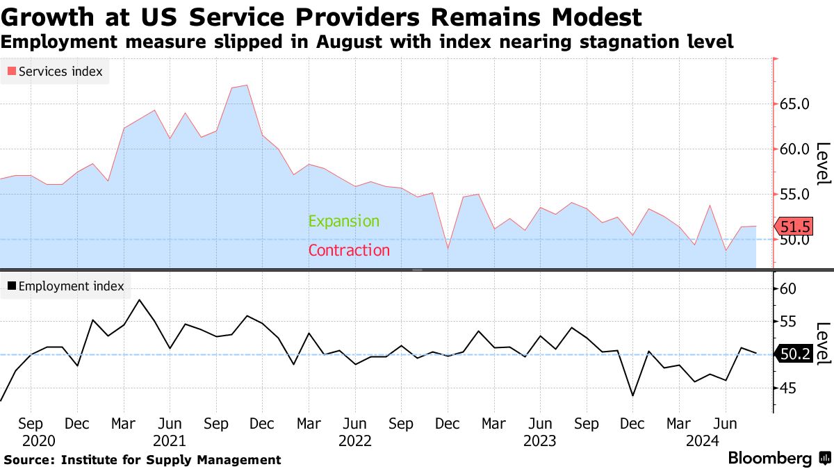 美国服务业在八月份以温和的速度扩张,这是第二个月,因为就业指标基本停滞,订单积压大幅下降。