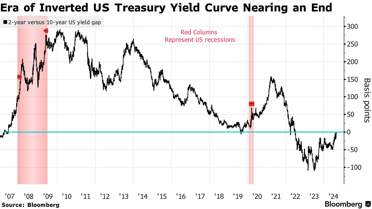收益曲线正常上升斜率的恢复或反转,通常发生在美联储开始降低利率或市场开始定价即将到来的降息时。由于中央银行在经济遇到困难时往往会放松政策,一些人认为这种反转(而不是反转本身)通常预示着衰退即将来临。目前,利率互换显示交易员预计在2024年剩余时间内美联储将降息超过一个百分点。