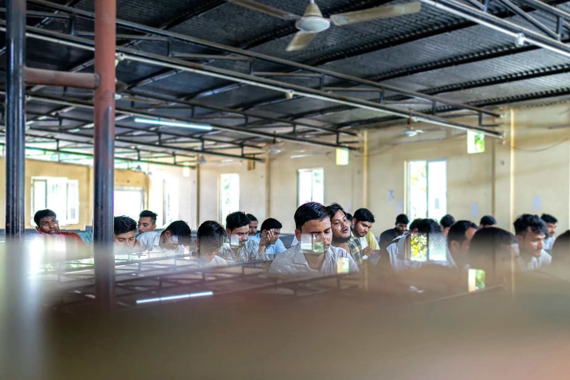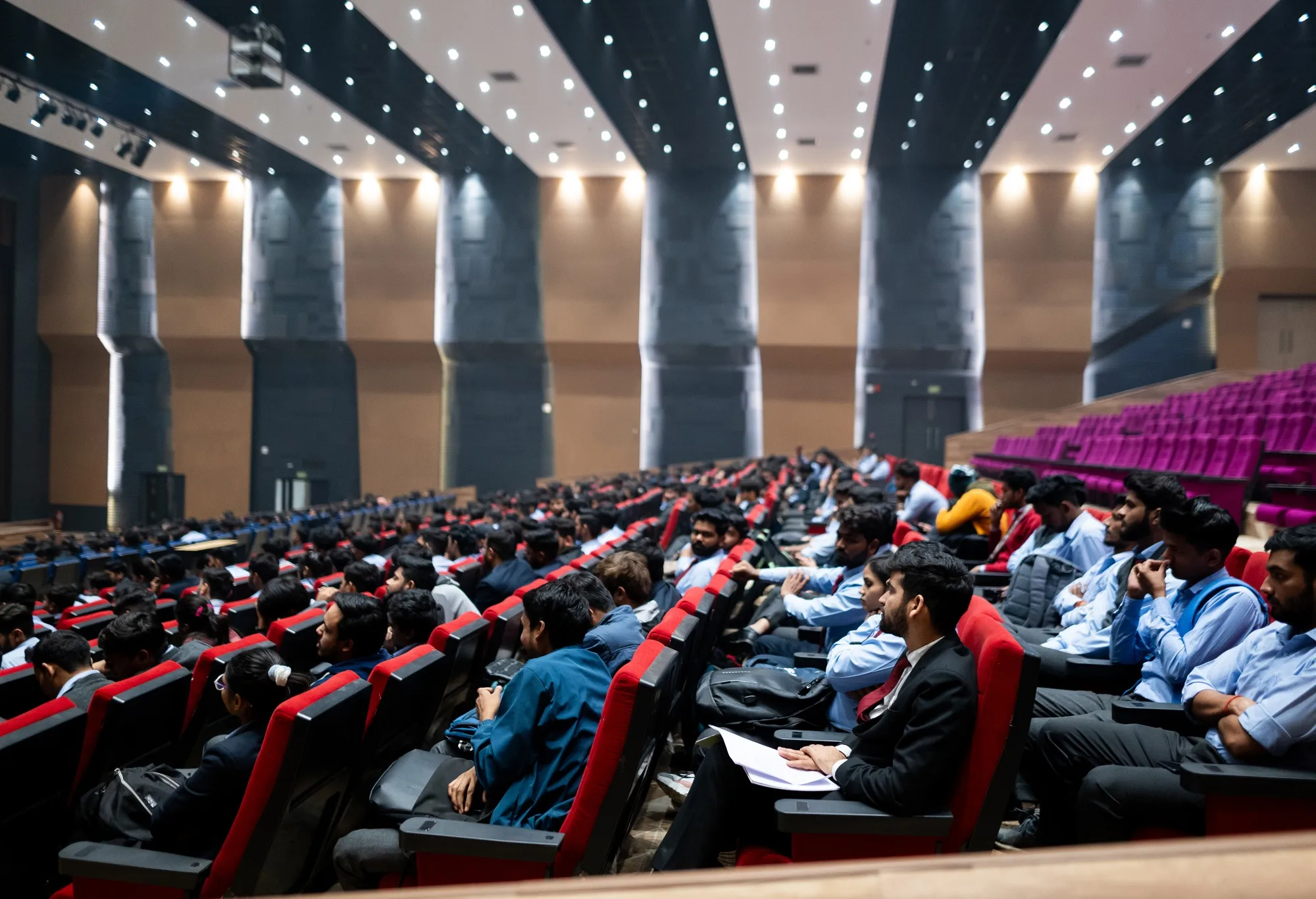 大学生于2023年11月在印度大诺伊达的学校礼堂参加招聘活动。摄影师:阿尼迪托·穆克吉/彭博社