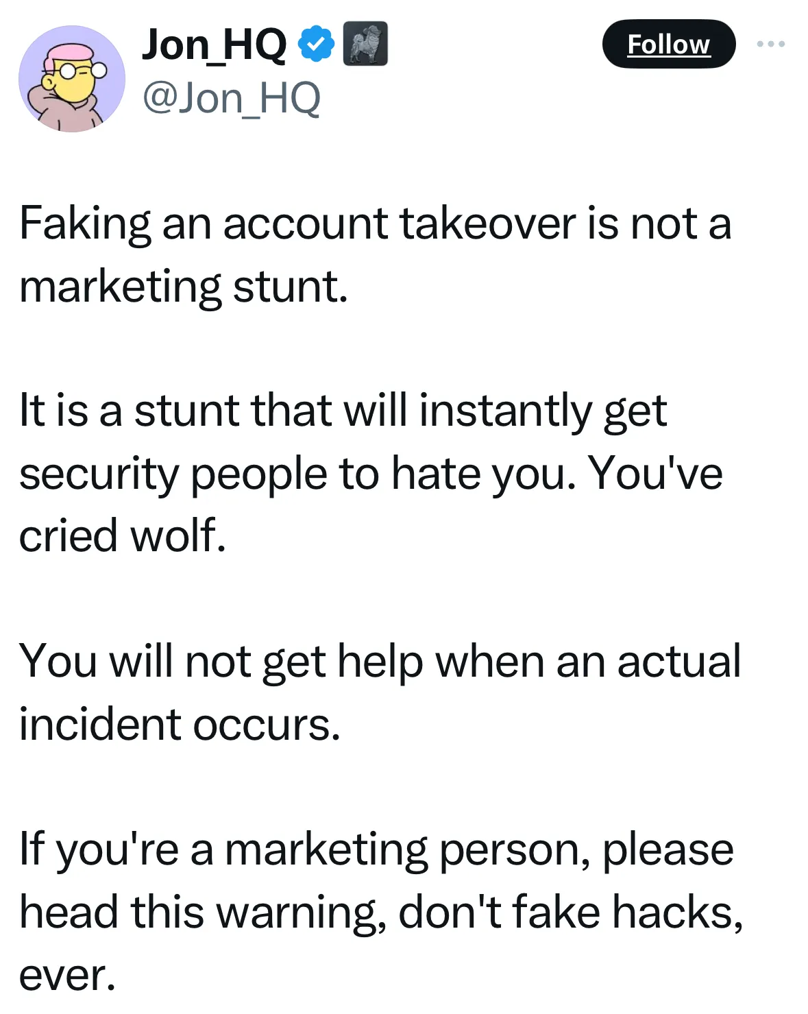 加密交易者开始传播NEAR账户被黑客攻击的消息,并等待通常接下来会出现的帖子:指示追随者购买新代币或将他们的钱包连接到一个会耗尽他们持有资产的智能合约。然而,这种信息并没有出现,尽管该账户继续发布,嘲笑其反对者并推广传统金融和技术服务。