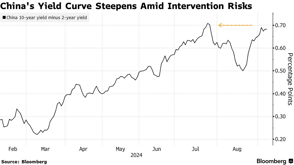 中国的主权收益率曲线正在陡峭化,这一举动可能会受到当局的欢迎,因为干预的威胁促使交易员减缓对长期债券的购买。