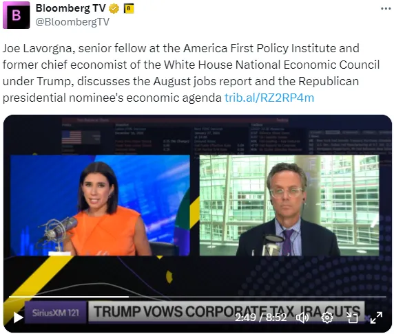 今天在彭博电视的权力平衡早间版中,主持人乔·马修和凯莉·莱因茨与美国优先政策研究所的高级研究员、特朗普政府国家经济委员会前首席经济学家乔·拉沃尔尼讨论了共和党提名人唐纳德·特朗普的经济议程。