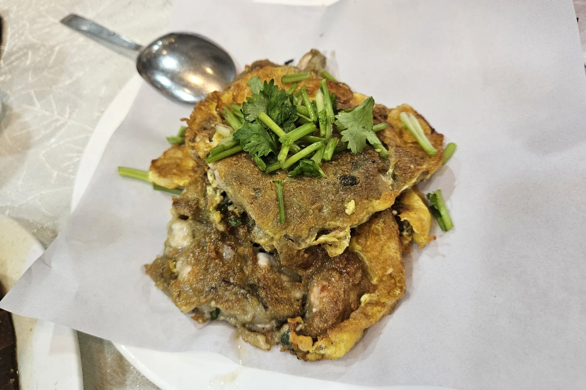 炒蚝仔配炒蛋(港币108元),这道经典菜肴通常标志着潮州餐厅的整体质量,非常棒。这道菜更像是煎蛋饼的混合体,配有丰富的蚝仔,味道浓郁。鸡蛋散发着焦香的气味,口感令人愉悦。