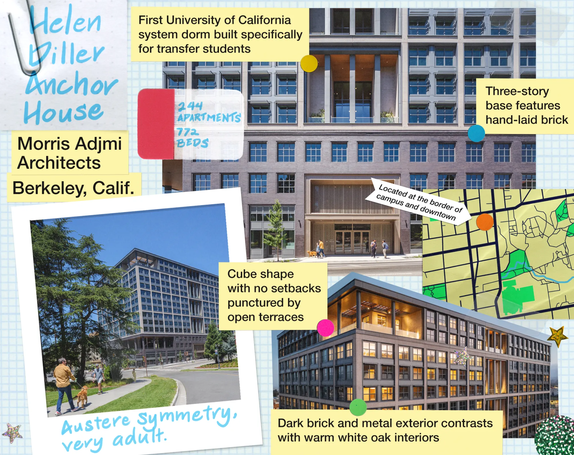 这座14层建筑位于校园的西边,距离市中心几条街,旨在桥接大学传统的新古典主义建筑与伯克利市中心更为多样化的风格。该地区很少有建筑能达到如此高度:Anchor House高达180英尺,距离城市最高的Chase大楼仅差几英尺。虽然Anchor House是一个校园项目,但它指向了伯克利的未来,伯克利目前正在审查至少五个更高住宅项目的提案,《旧金山纪事报》。